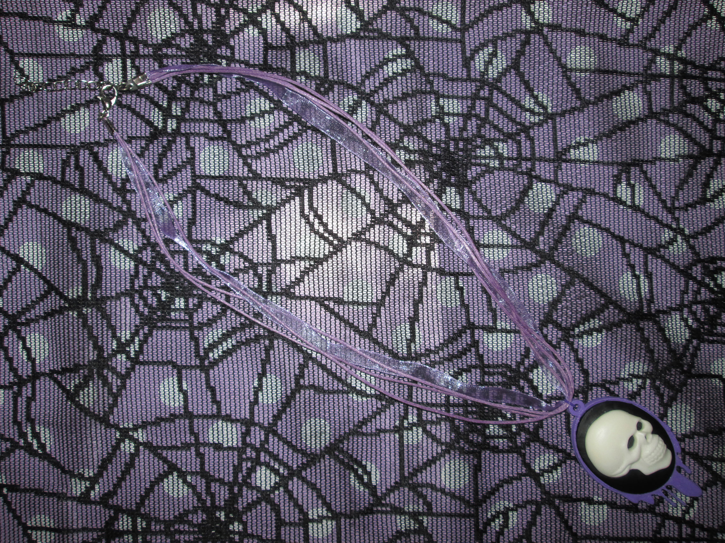Vraiment une pièce phénoménale, elle consiste d’un collier lilas en organza, et un camée crâne en noir et blanc dans un cadre avec des gouttes lilas qui tombent de la base. La longeur du collier est 23 cm à l'exclusion du pendentif, le pendentif est 6 cm par 3.5 cm.