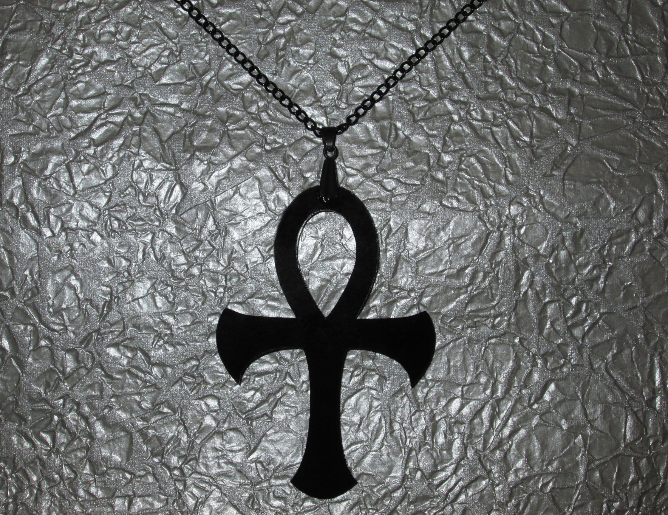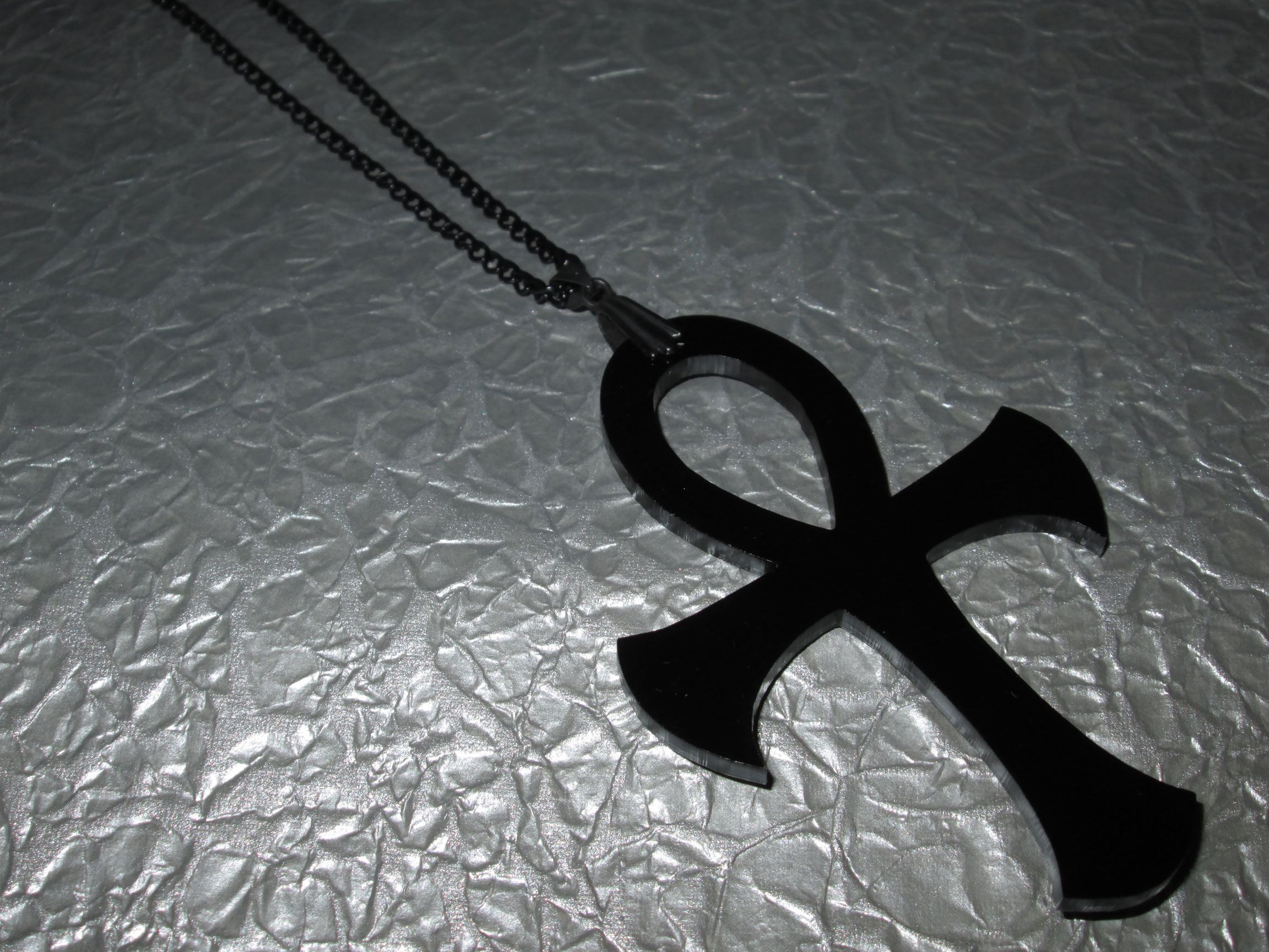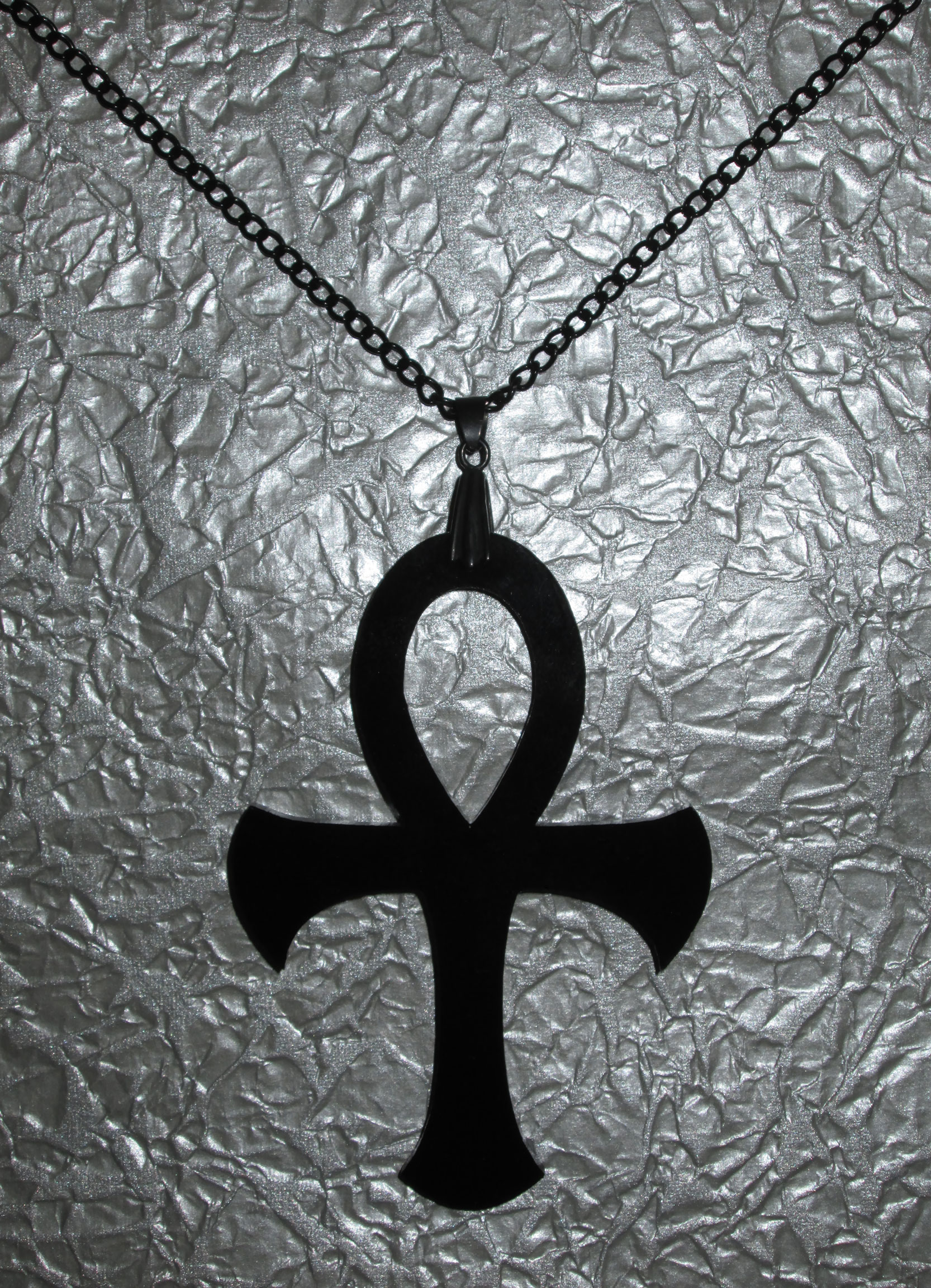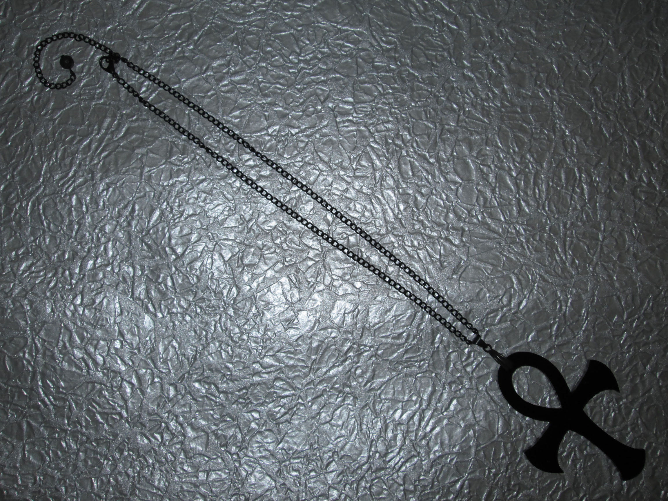 Voilà un collier magnifique! Ça consiste d’un pendentif ankh en acrylique noir, une bélière détaillée en noir, de la chaîne noire, et une perle de lave noire qui tombe de l’extension à l’arrière. C’est un collier très frappant, j’en ai un moi-même et je reçois des compliments dessus tout le temps!
