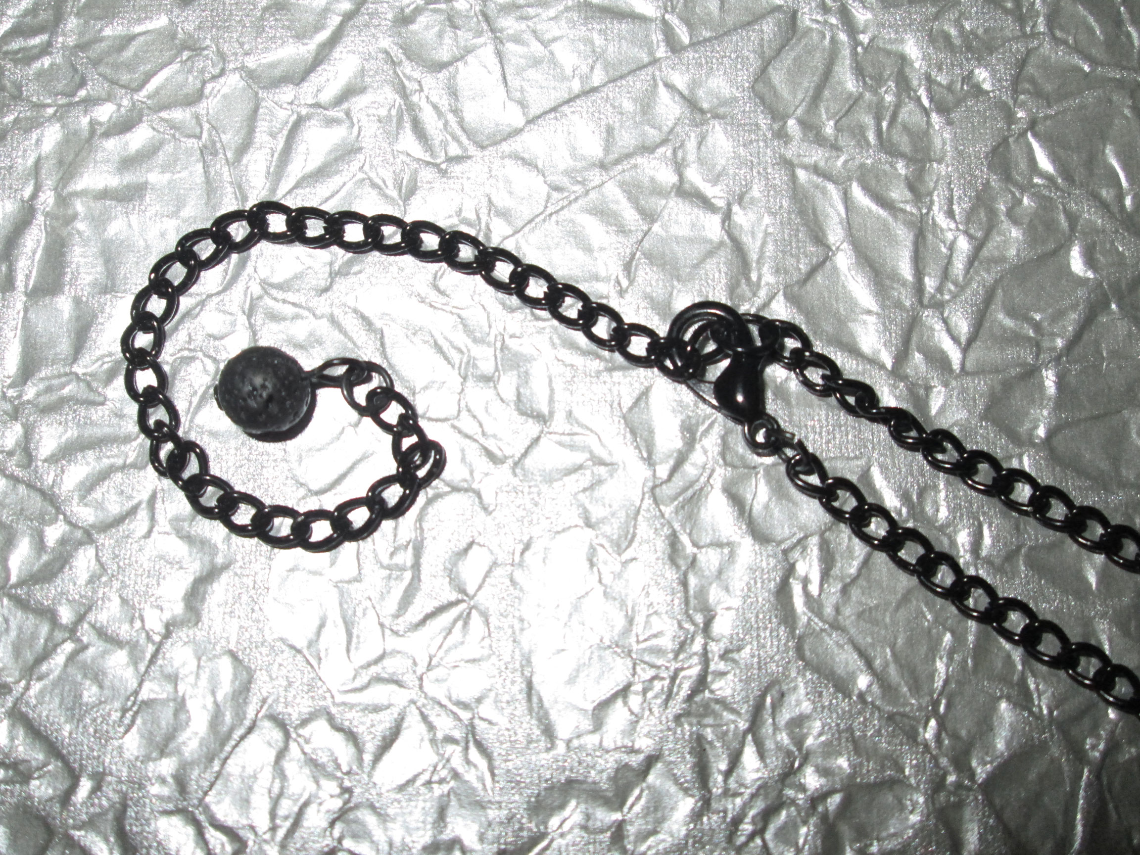 This is an amazing necklace! It consists of a black acrylic ankh, intricate black bail, thin black chain, and a black lava bead hanging from the extension in the back. It’s quite striking, I have one myself and get compliments on it all the time!