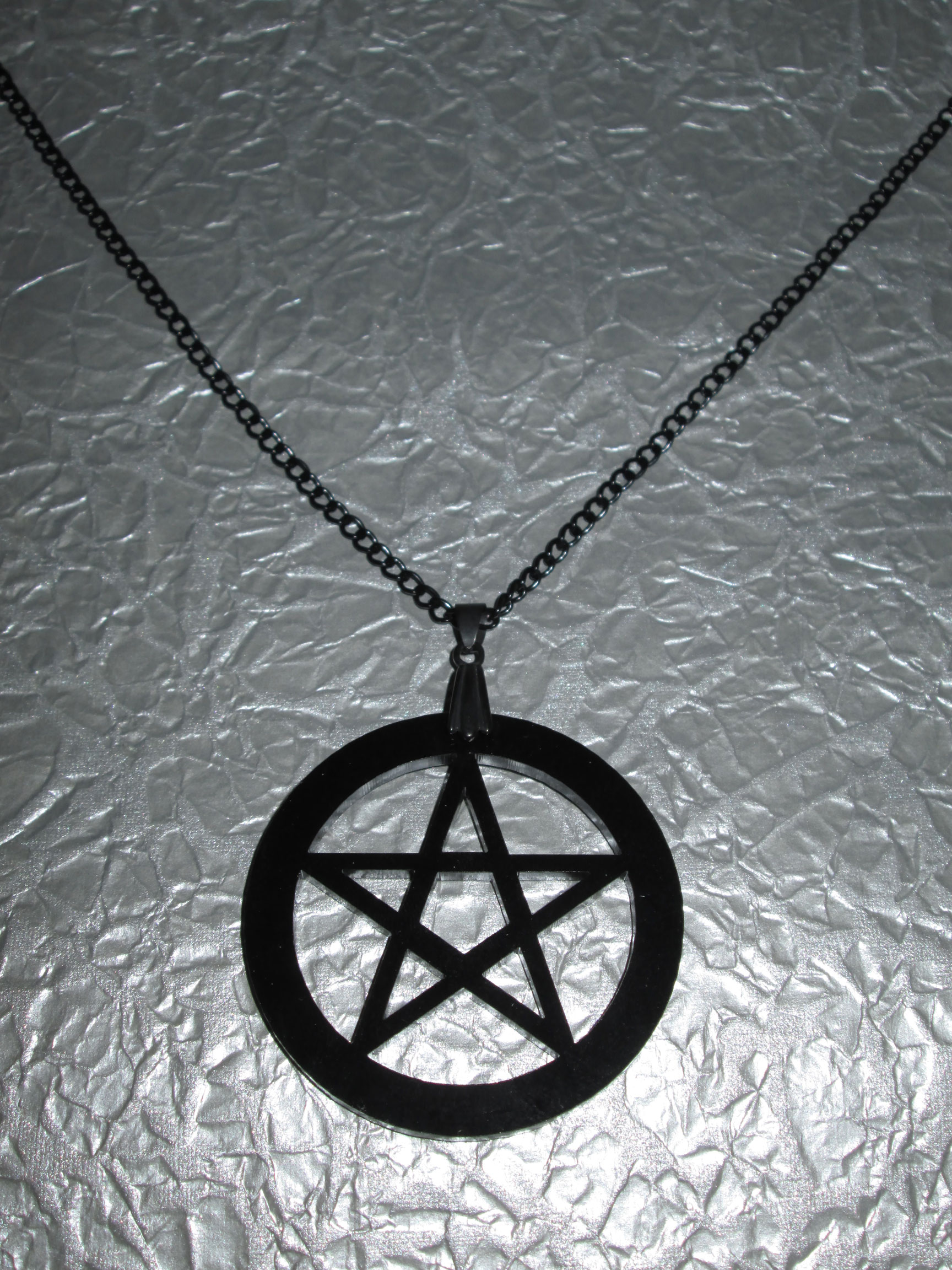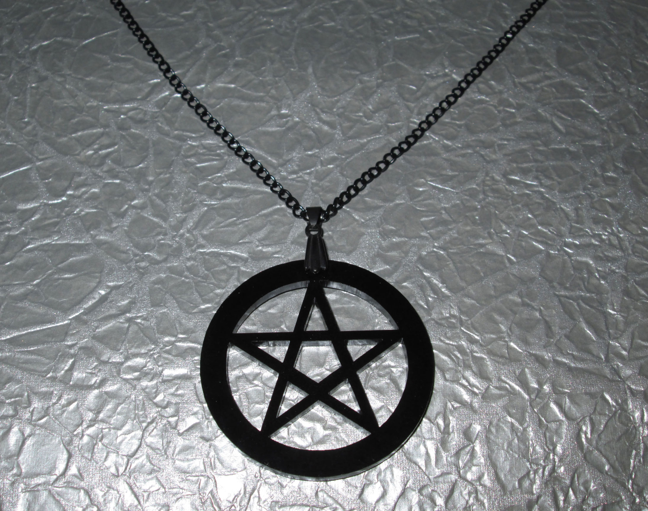 You can’t miss with this classic necklace! It consists of a black acrylic pentagram, intricate black bail, thin black chain, and a black crystal hanging from the extension in the back. Lovely addition to any outfit!