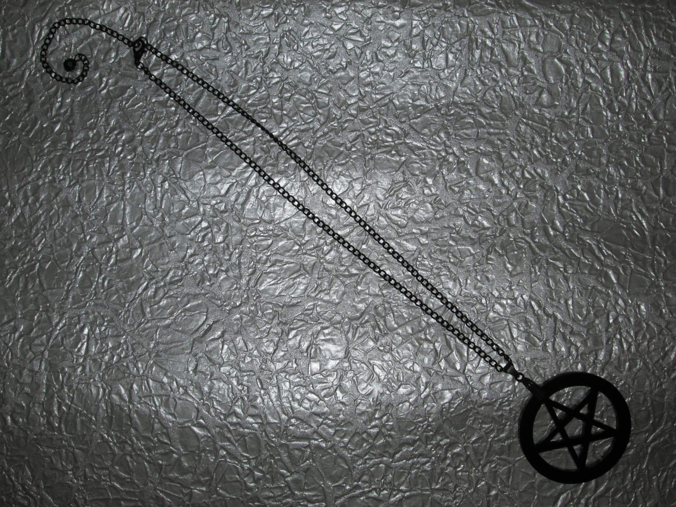 Ce collier est vraiment classique! Ça consiste d’un pendentif pentagramme en acrylique noir, une bélière détaillée en noir, de la chaîne noire, et un cristal noir qui tombe de l’extension à l’arrière. Addition parfaite pour n’importe quel ensemble!