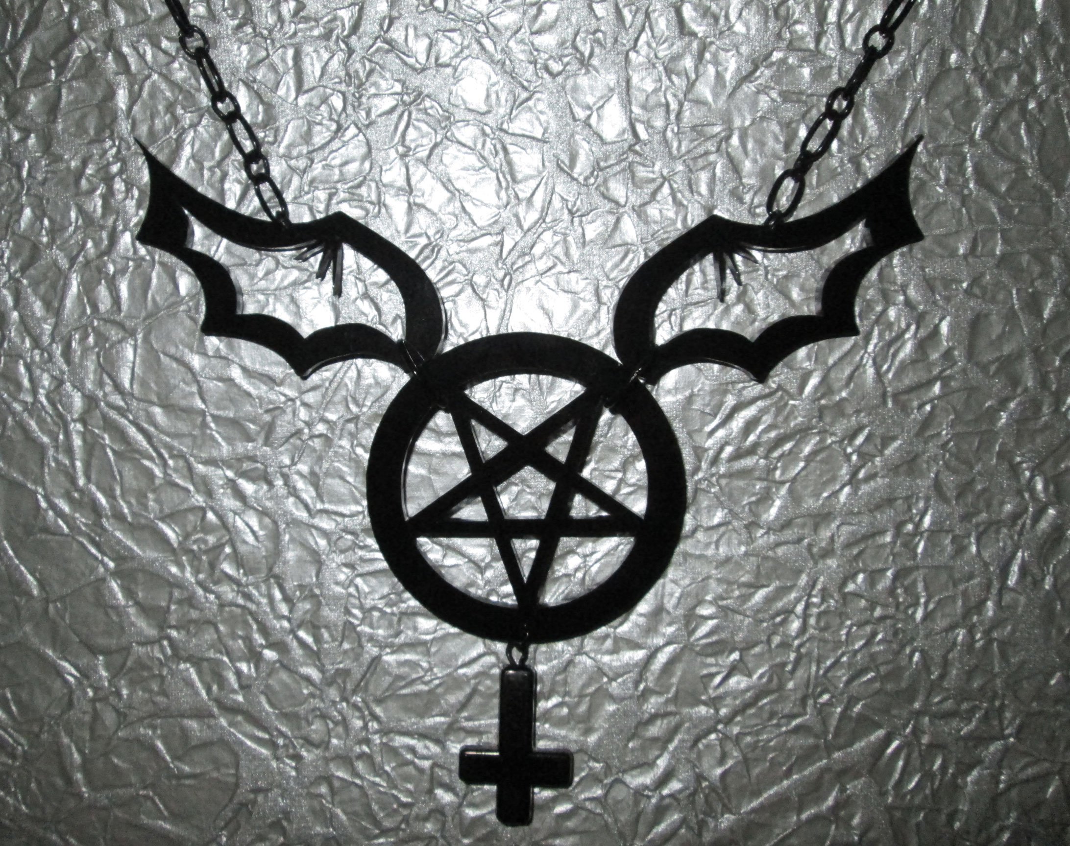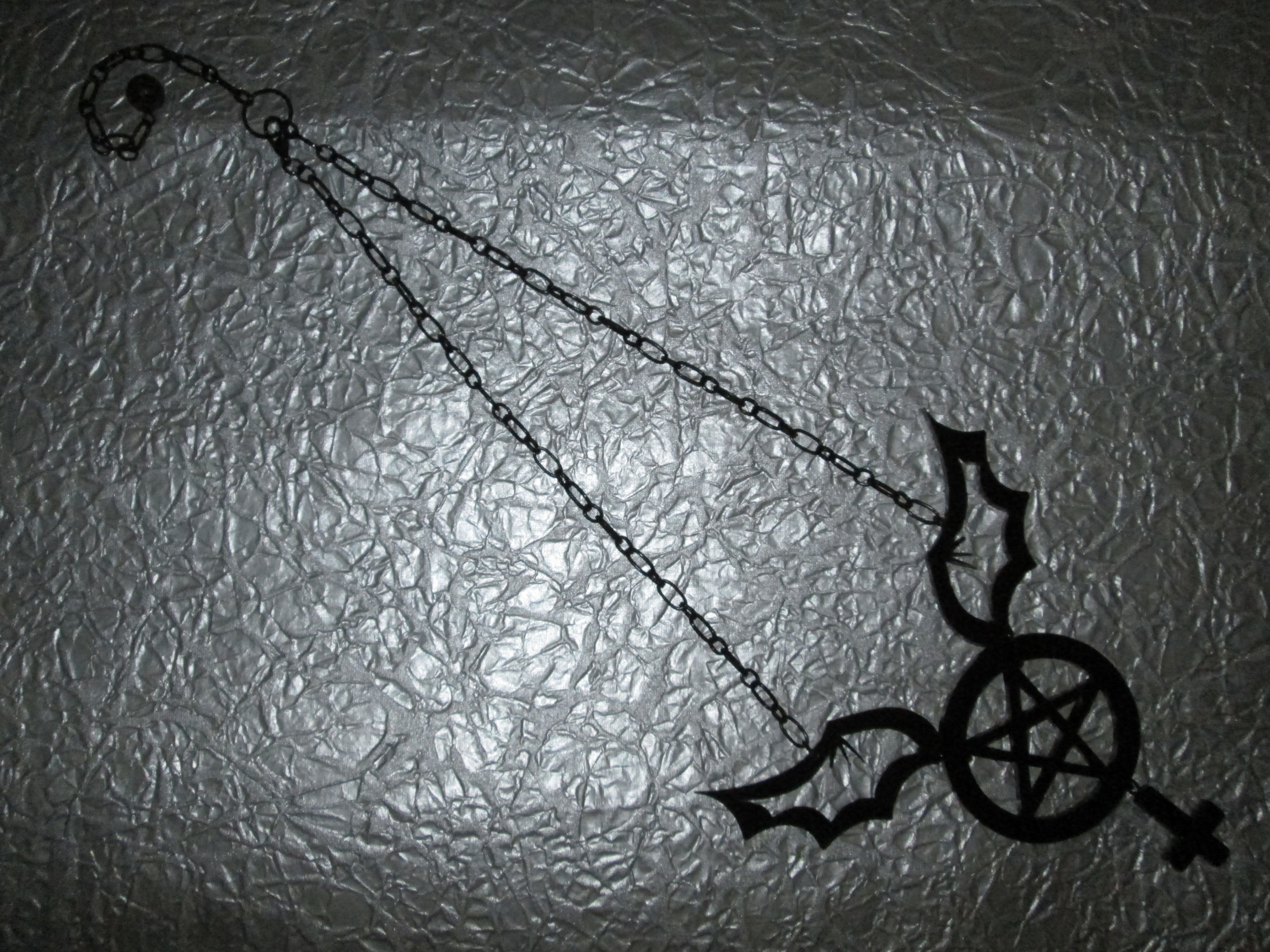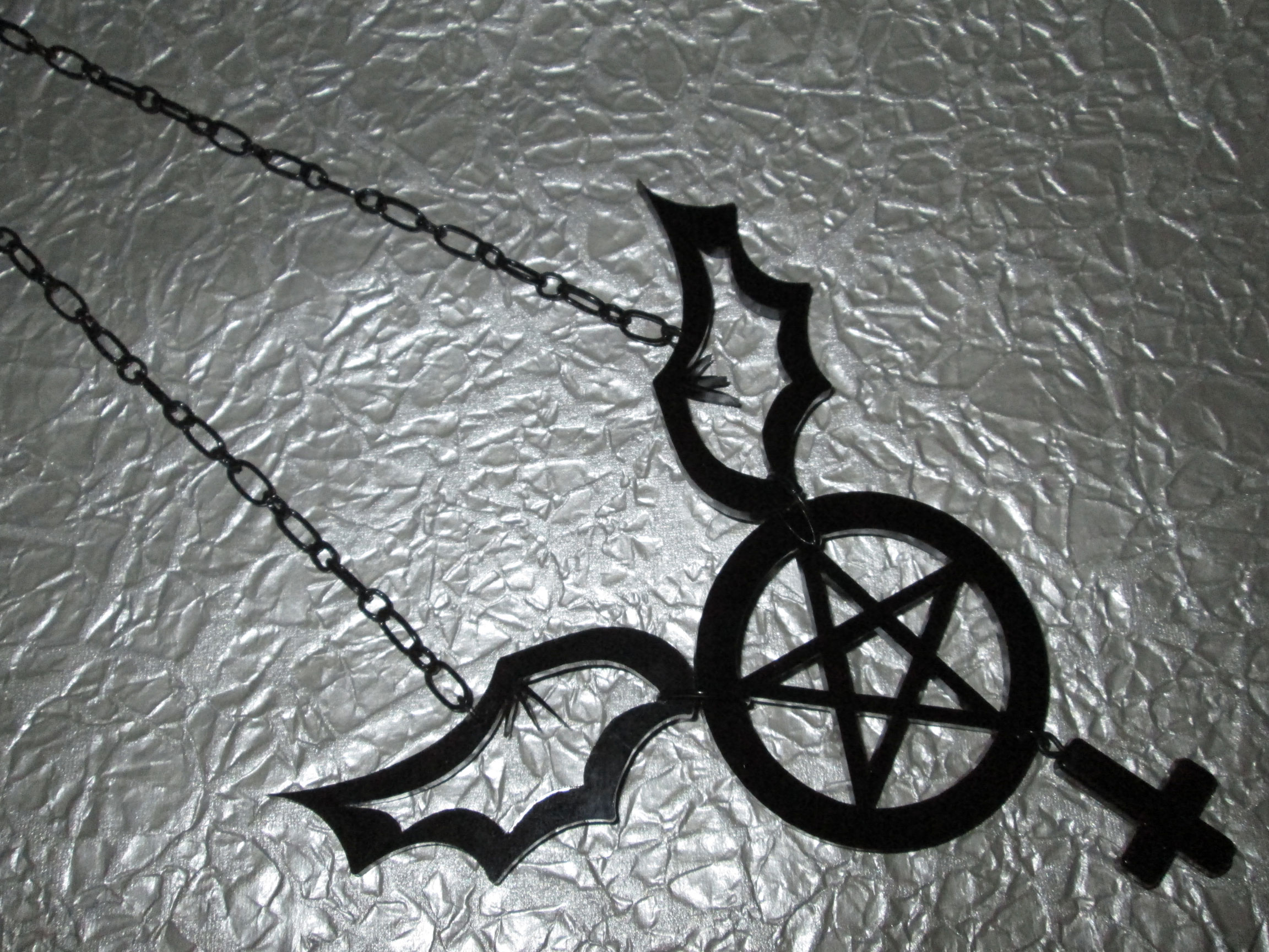 Êtes-vous un fan de symboles occultes? Si oui, ce collier est pour vous! Ça consiste d’un pendentif pentagramme à l’envers en acrylique noir, des ailes chauve-souris en acrylique noir, une croix noire à l’envers, de la chaîne noire, et une perle de lave noire qui tombe de l’extension à l’arrière. Définitivement une pièce unique!