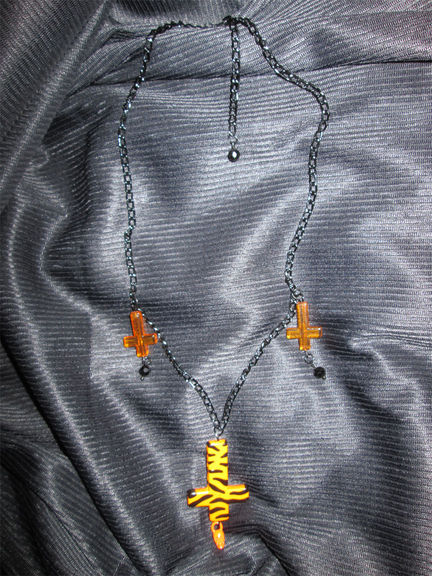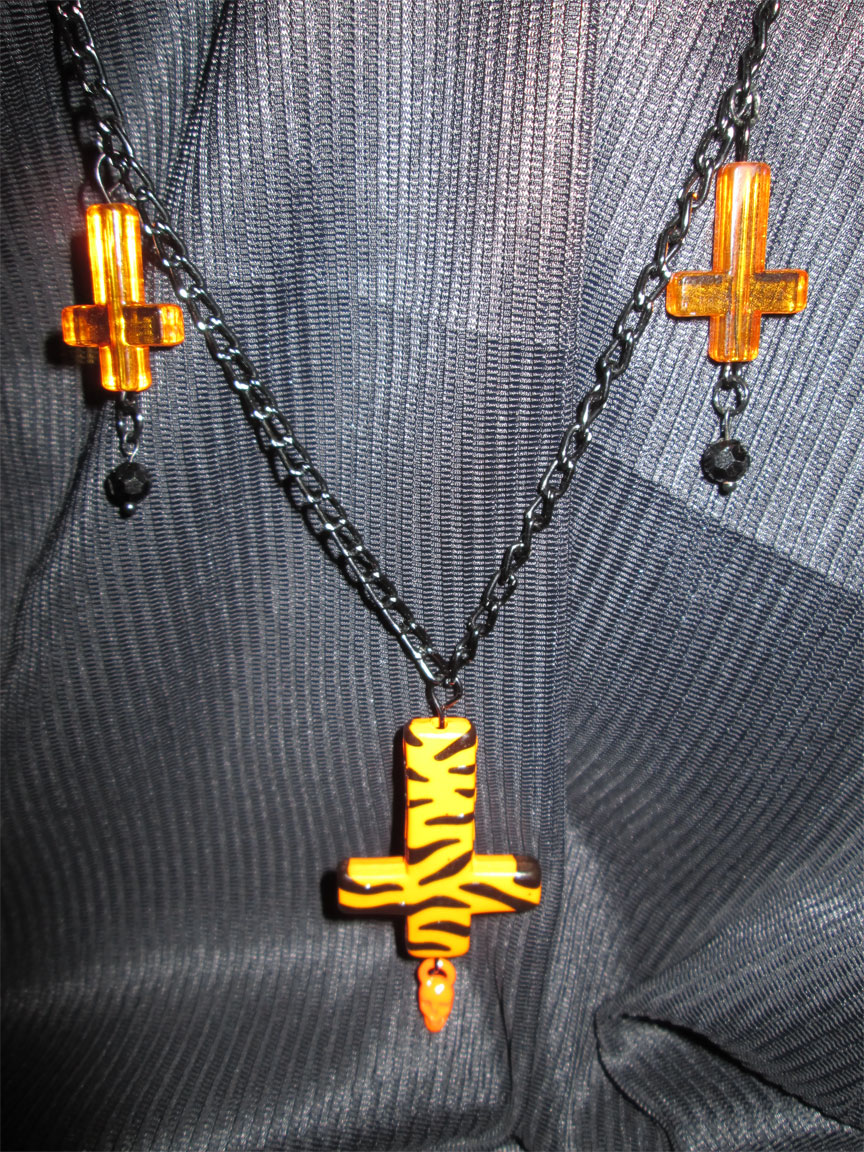 Voici un collier très joli en noir et orange avec une croix à l’envers en motif zèbre et deux croix orange à chaque côté. Il a des cristaux noirs comme accent, incluant un à l’arrière, et un pendentif délicat d’un crâne orange en dessous la croix majeure. Vraiment magnifique comme collier!
