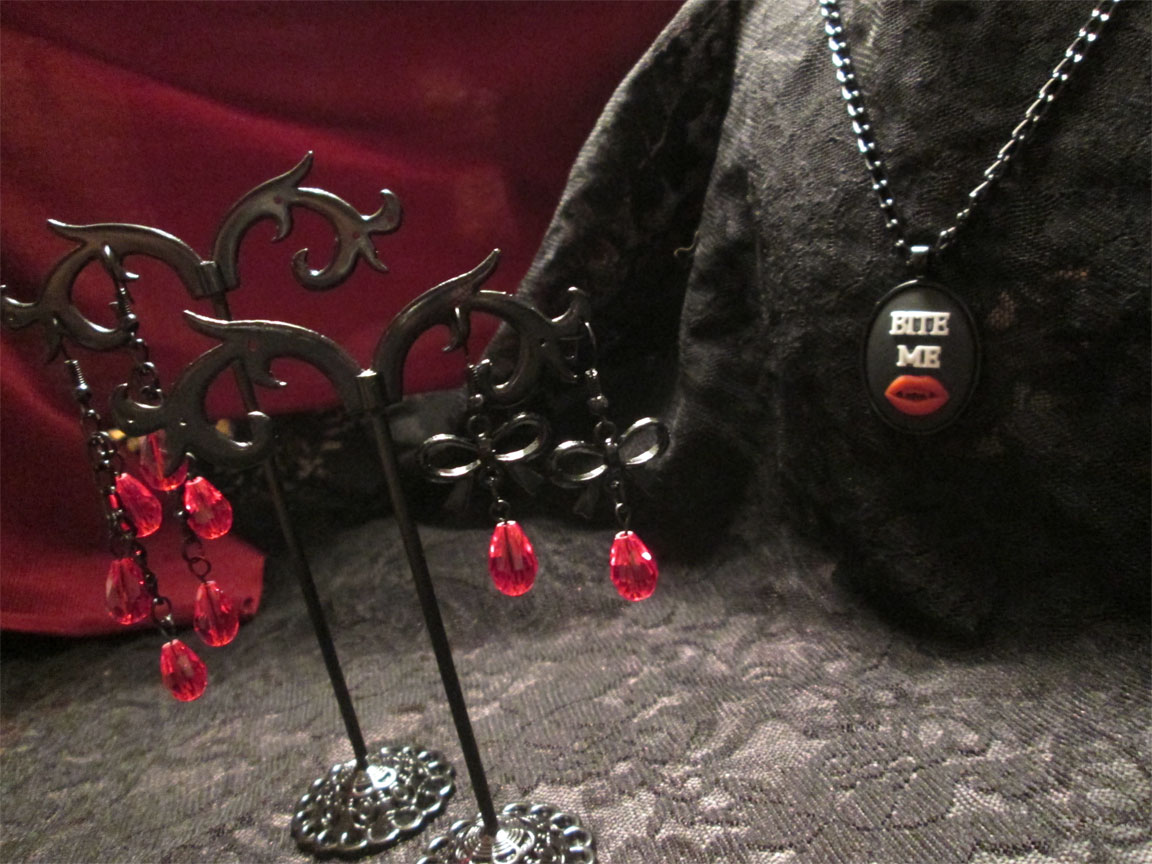 Cet ensemble inclut un joli collier vampire et votre choix de boucles d‘oreilles. Le camée a les mots “Bite Me” dessus, et des lèvres vampire, est placé dans un cadre noir et se pendre d’une chaîne noire. Il y a aussi un cristal rouge qui tombe à l’arrière. Vous avez le choix entre deux paires de boucles d’oreilles, une paire avec des noeuds noirs et cristaux rouges, et l’autre est fait de la chaîne noire et des cristaux rouge. En achetant ce duo, vous épargnez de l’argent en place de les acheter séparément! Parfait pour ceux et celles qui aiment les vampires!