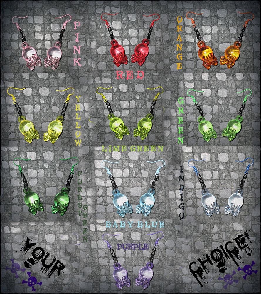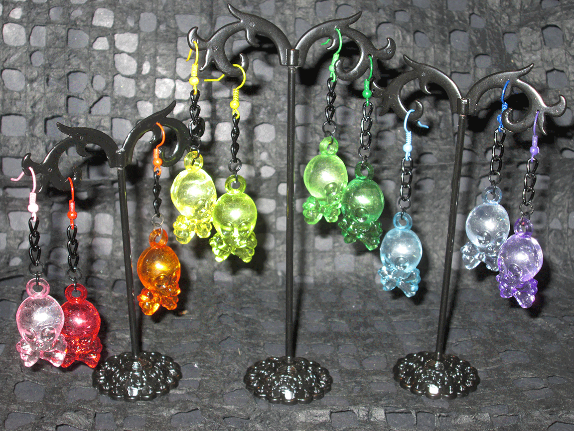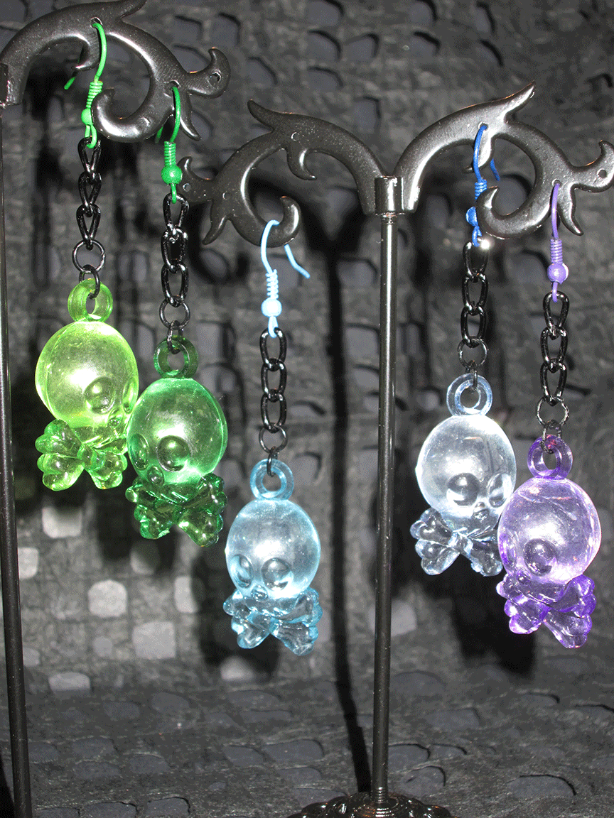 The cutest earrings that ever were, these skull and cross bone earrings come in every color of the rainbow and more! The earrings consist of black chain, colored see-through acrylic skull and cross bone pendants, and matching colored earring hooks. They are just lovely! Go ahead! Treat yourself!