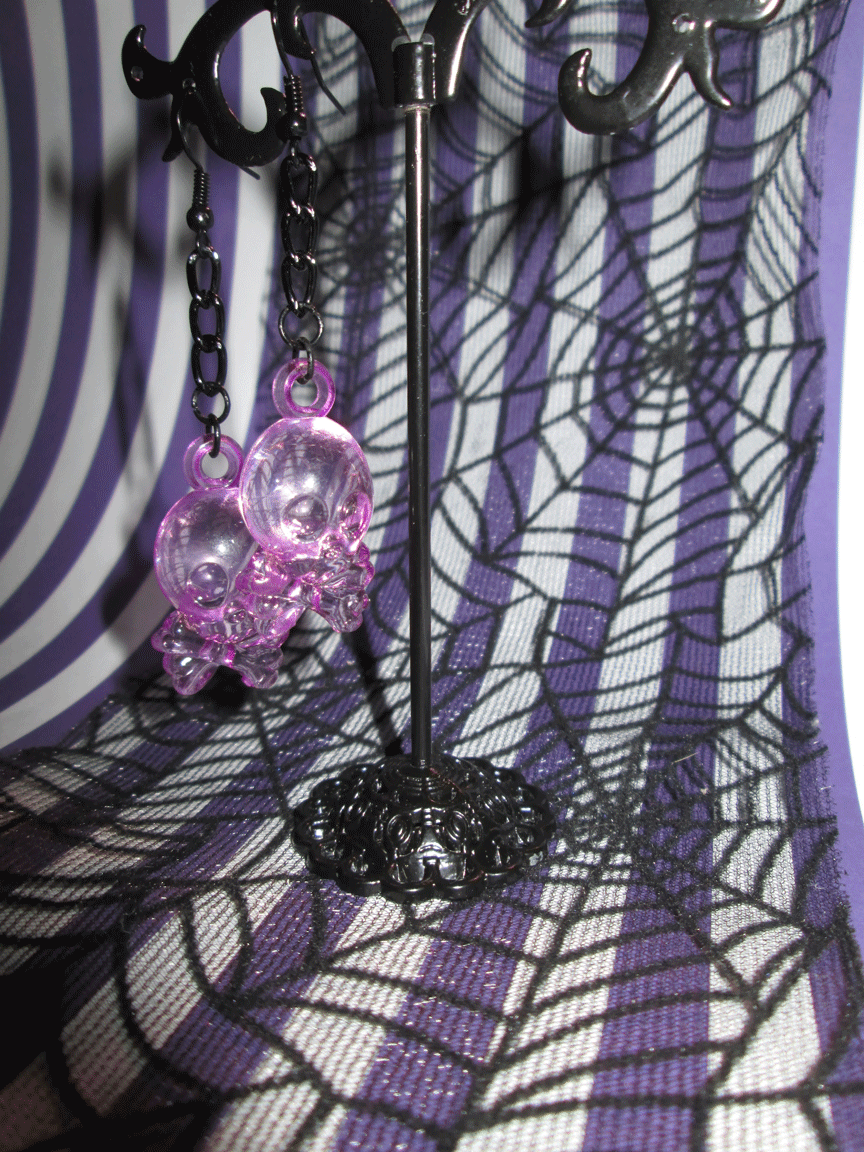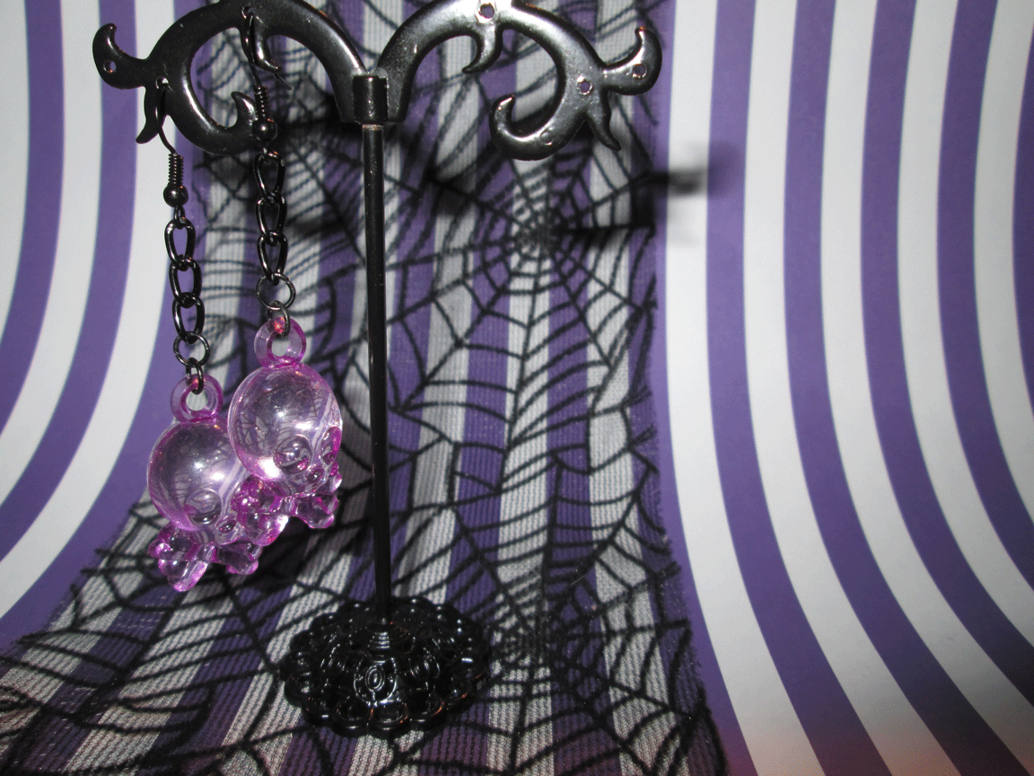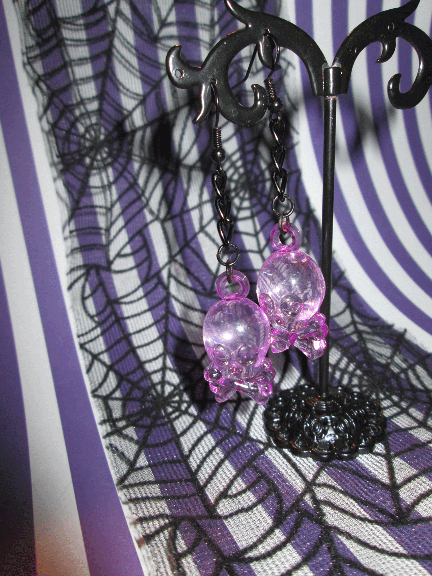 The cutest earrings that ever were, these skull and cross bone earrings come in fuchsia and black. The earrings consist of black chain, fuchsia see-through acrylic skull and cross bone pendants, and black earring hooks. They are just lovely! Go ahead! Treat yourself!