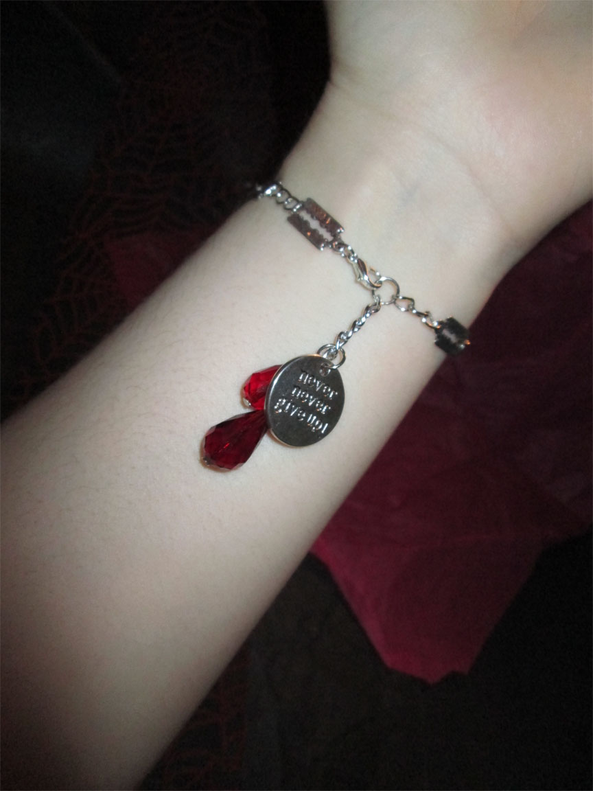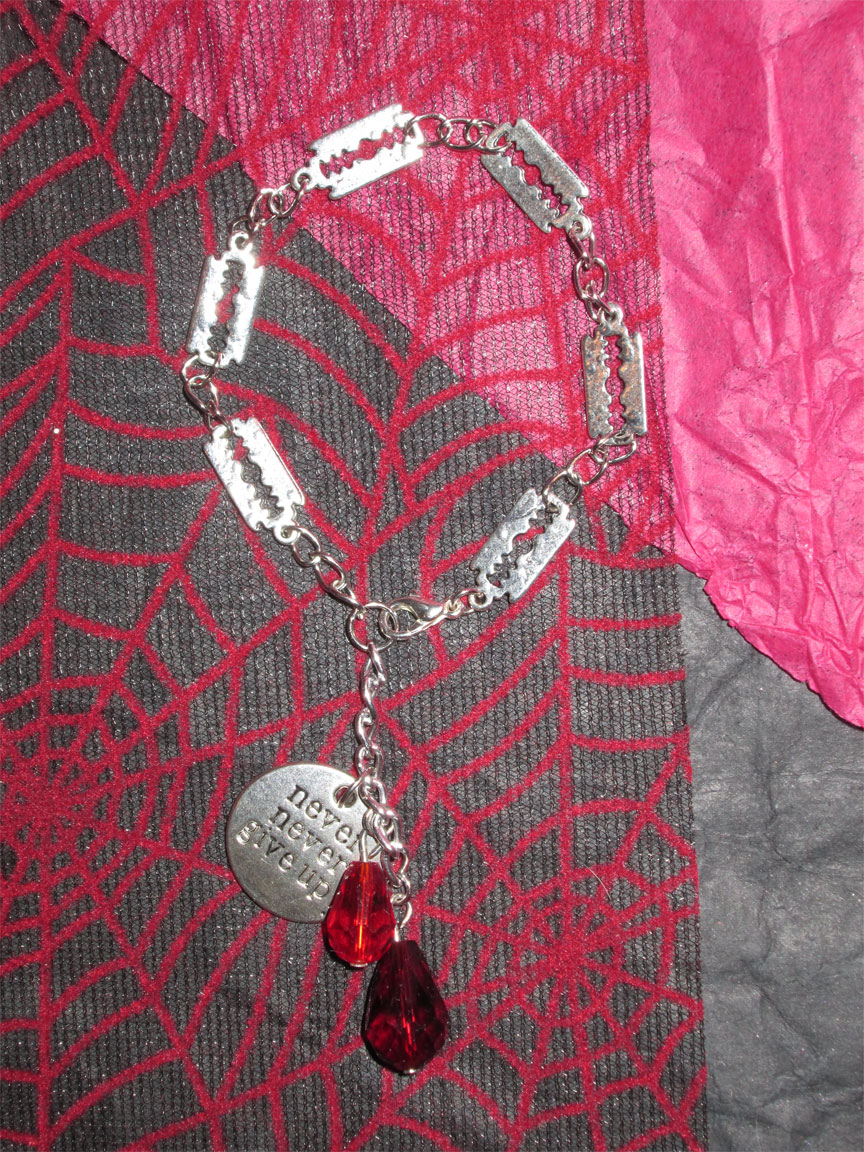 Ce bracelet a une chaîne argentée simple qui alterne avec des pendentfs des lames de rasoir autour du poignet. Un fois attaché, le bracelet a des cristaux rouge qui tombent du poignet, ainsi qu’un pendentif qui dit “Never Give Up” (n’abandonne jamais). Ce bracelet est parfait pour tout ceux et celles qui ont souffrit des maladies d’automutilation ou ceux qui leur donnent un soutien. Même si vous voulez juste vous faire rappeler que vous allez survivre même si la vie peut être difficile, ce bracelet est parfait pour quelqu'un qui peut se rapporter à la pièce elle-même! Une merveilleuse pièce d’avoir!
