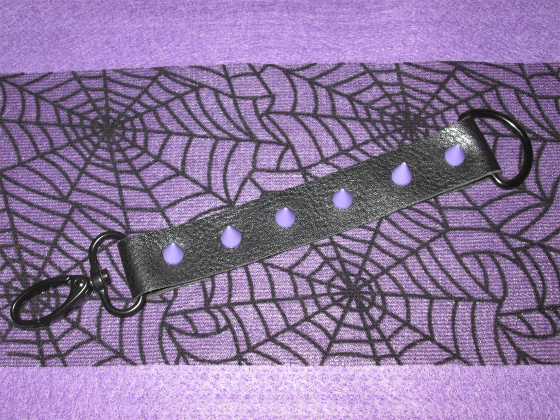 Un bracelet vraiment jolie et simple! Ça consiste d’un morceau du vrai cuir en noir, des pointes en métal lavande, un anneau ‘d’ en noir, et un fermoir en métal aussi en noir. Le fermoir s’attache à l’anneau ‘d’ en faisant une fermeture facile. Le bracelet est fait pour une femme ou je disais un homme mince. Cela étant dit, je vous conseille de mesurer la circonférence de votre poignet, juste pour être sûr. La circonférence du bracelet mesure environ 17.5cm, alors s’il vous plaît être sûr que votre poignet est moins que ça. Si vous voulez ce bracelet dans une taille plus grand, faites-moi signe et je serai heureuse de vous accueillir!