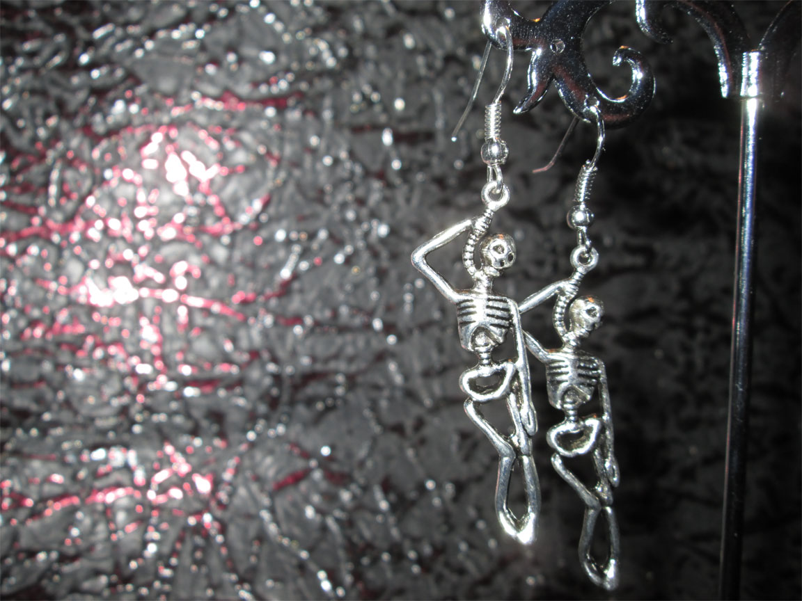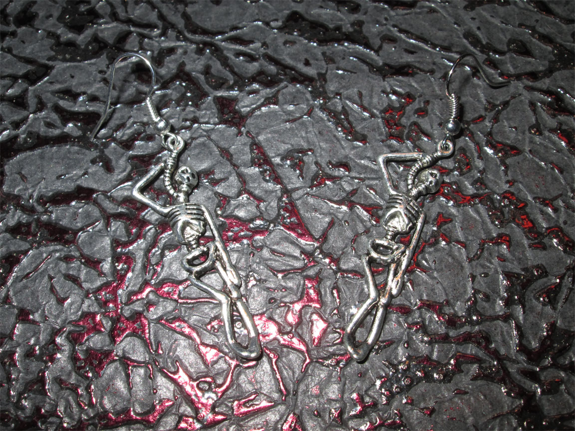 Lovely pair of earrings in a silver tone, with detailed skeleton charms hanging from the earrings as if from a noose. Definitely for those who love the macabre!