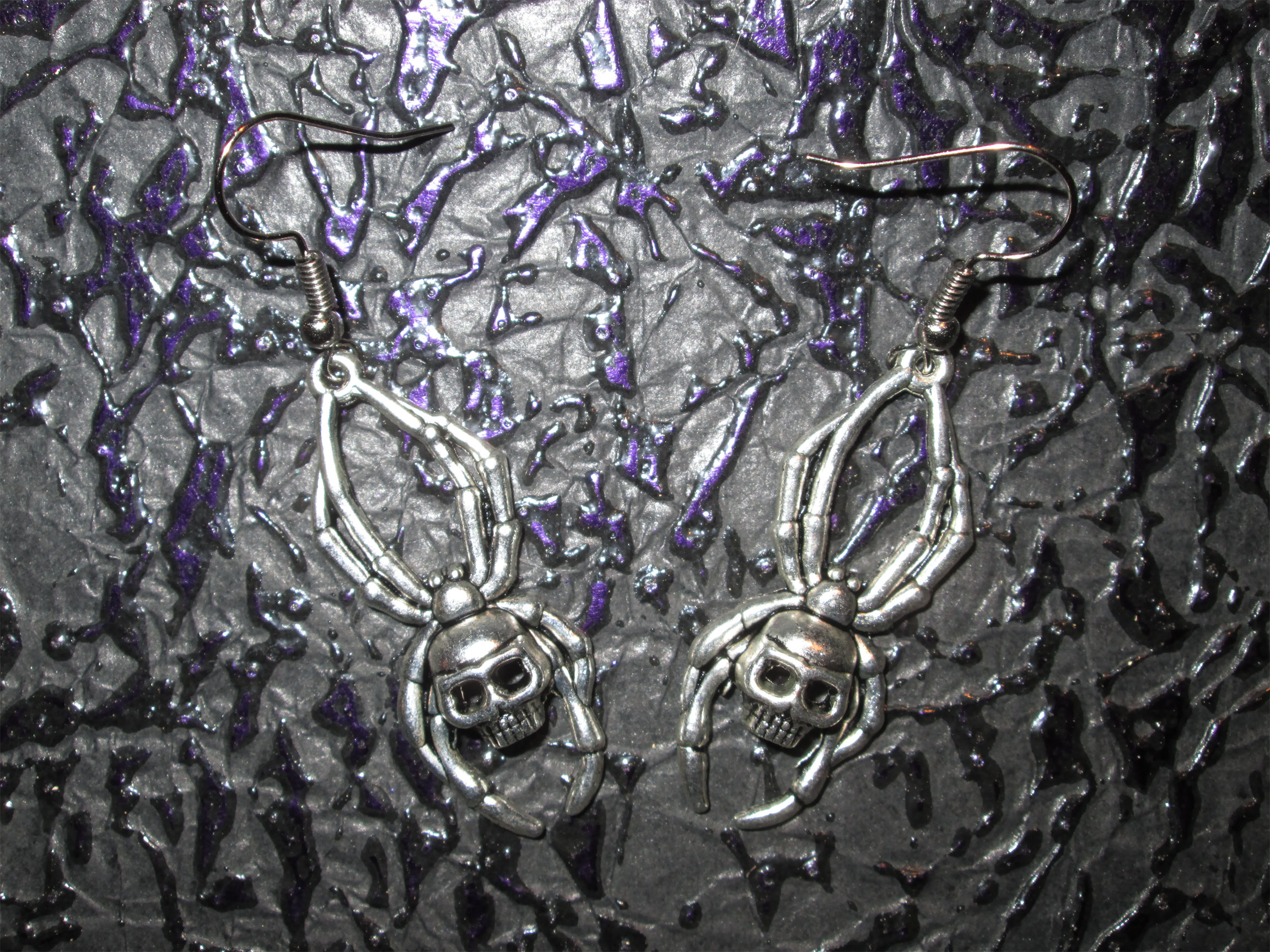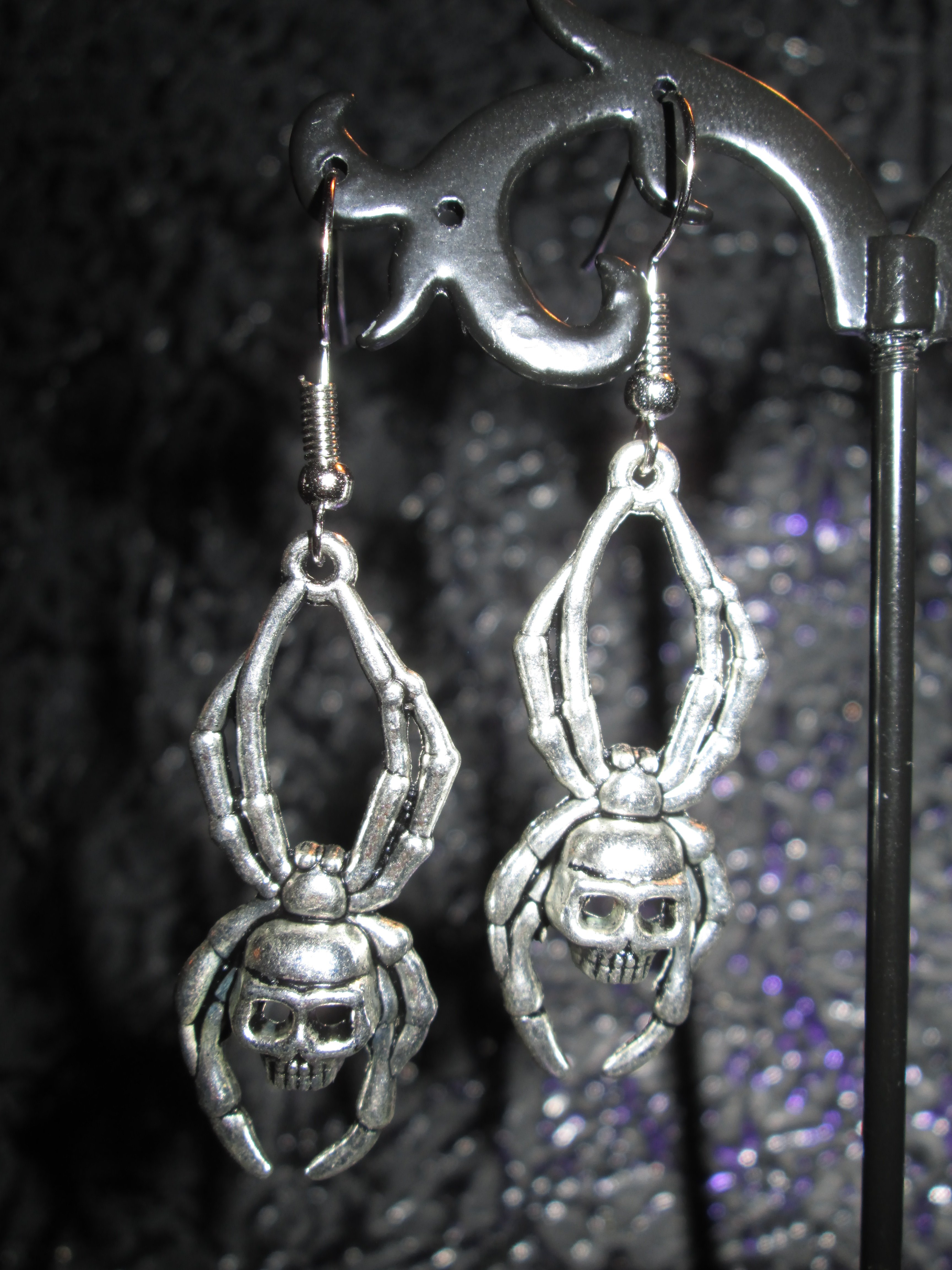 Lovely pair of earrings in a silver tone, with striking spider charms that have skulls for the spiders’ bodies! Definitely unique, the perfect addition to any spooky wardrobe!