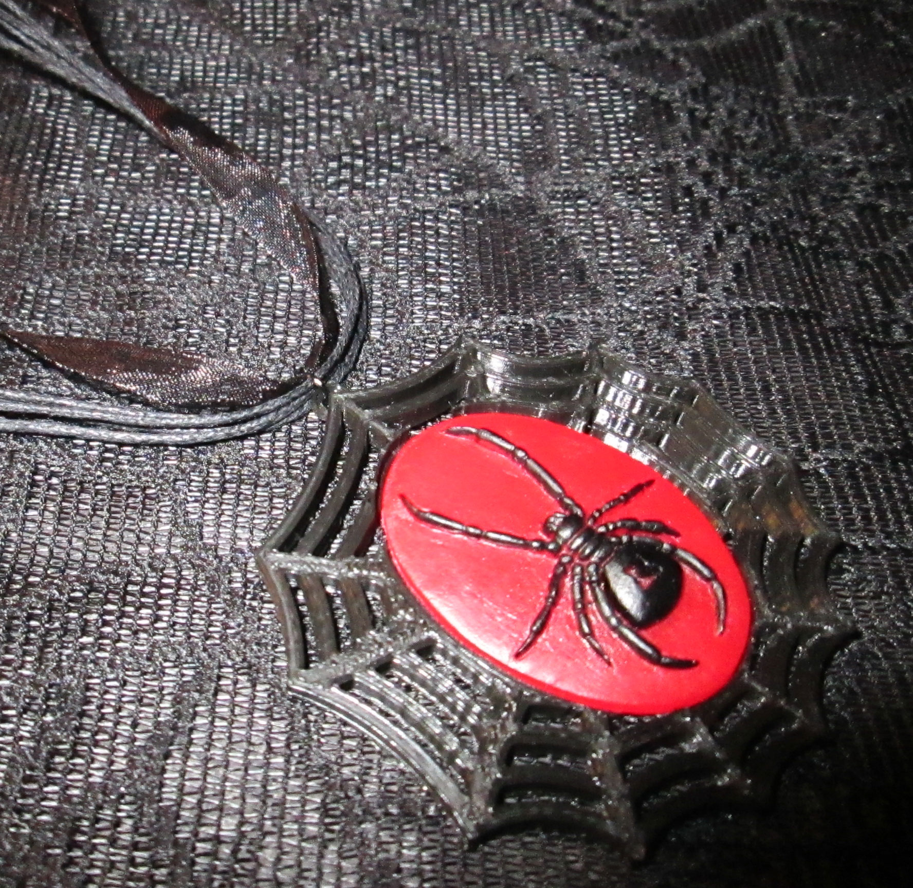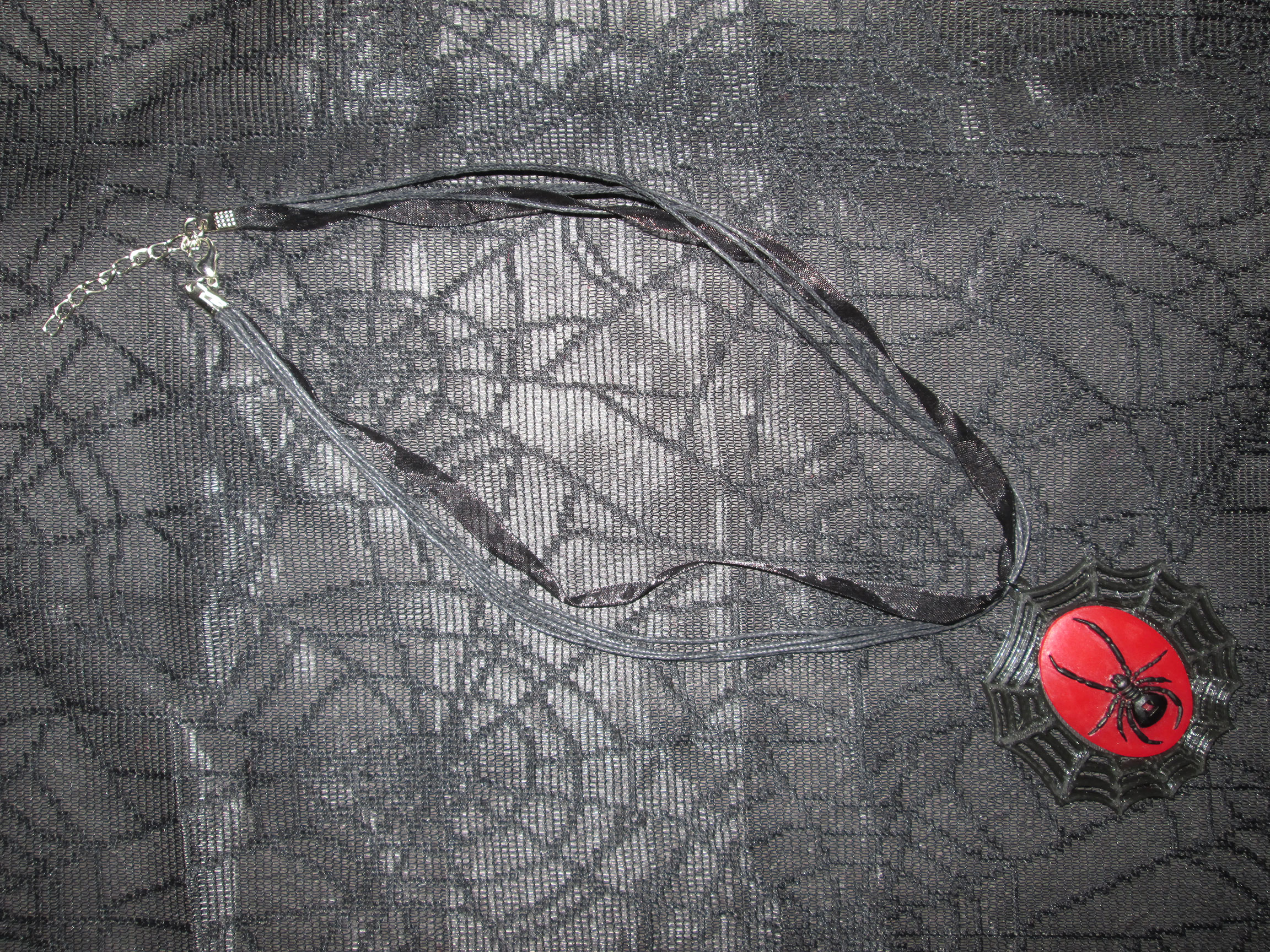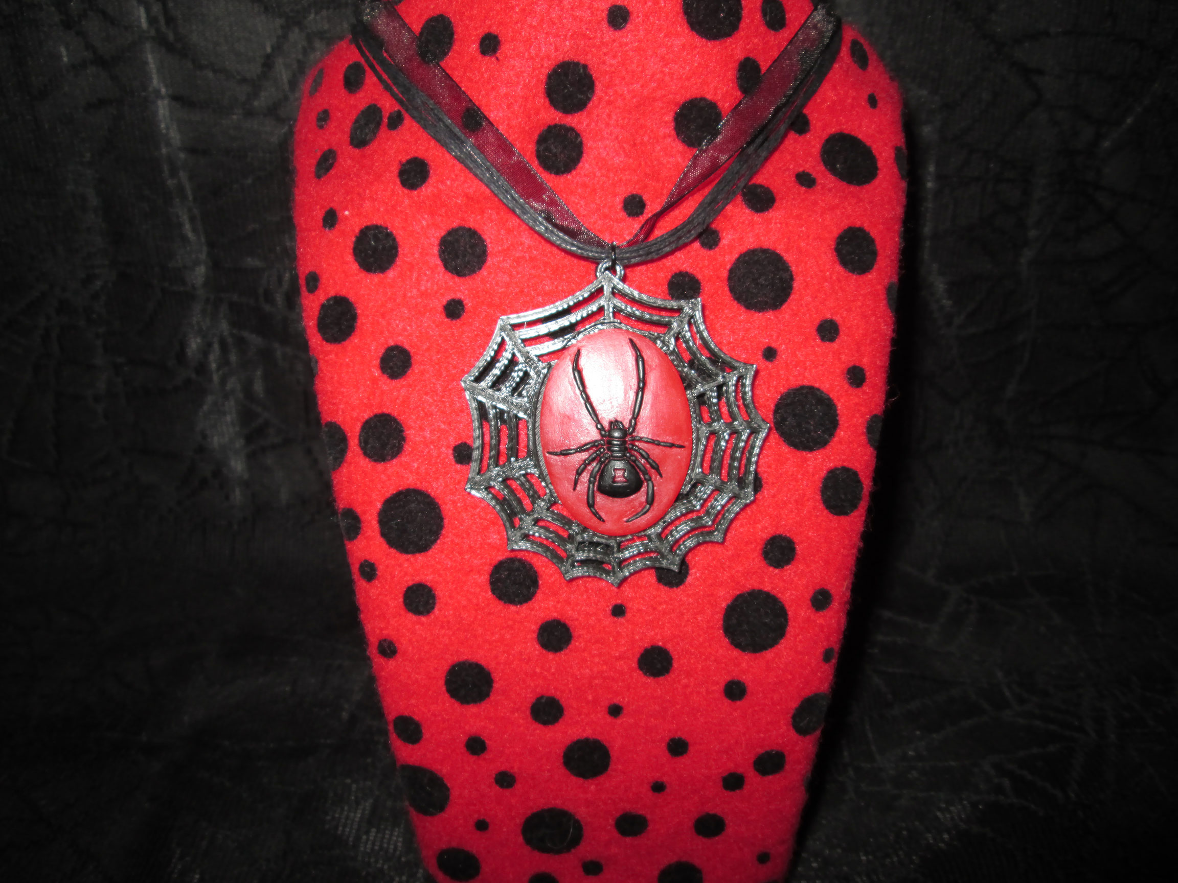 Vraiment une pièce phénoménale, elle consiste d’un collier noir en organza, et un camée araignée en rouge et noir dans un cadre toile d’araignée en noir. La longeur du collier est 23 cm à l'exclusion du pendentif, le pendentif est 6 cm par 6 cm.