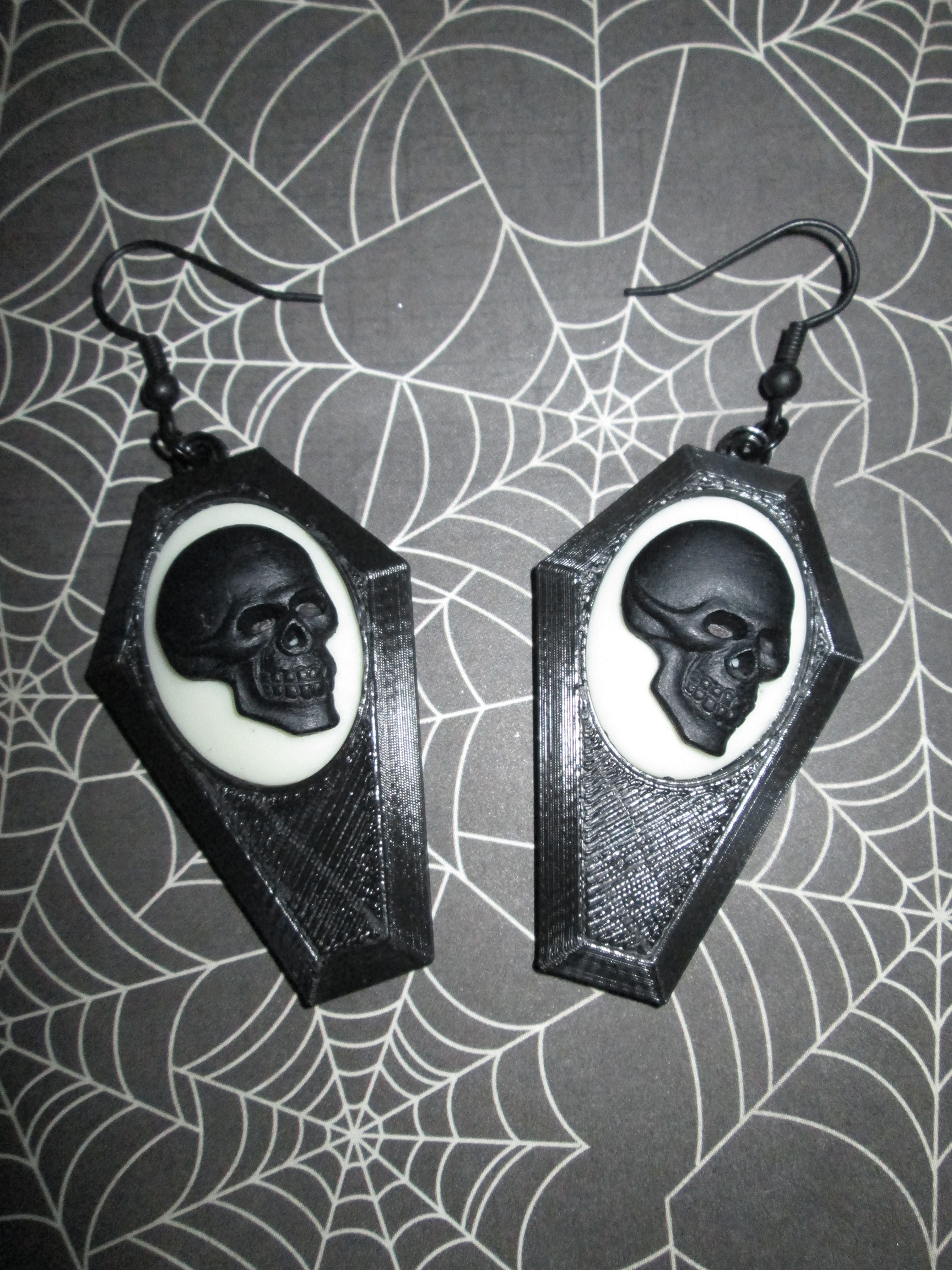 Such an amazing piece! They consist of black earring hooks, black jumprings, and black on white skull cameos in black coffin frames.