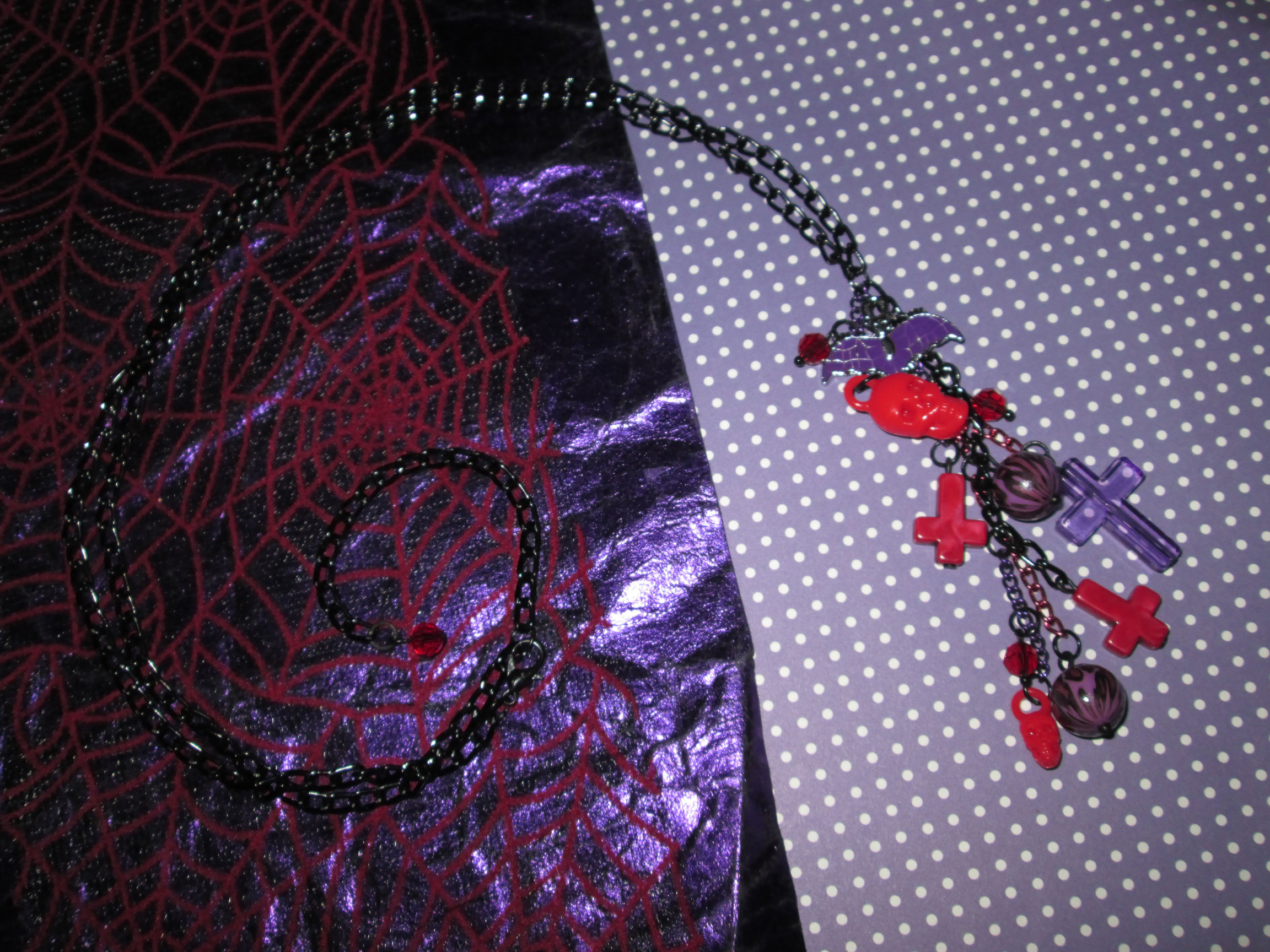Ce collier est vraiment frappant, il est super long alors ça tombe au-dessus du nombril ou jusqu’au nombril en dependant de ton hauteur. La pièce maîtresse contient des petites croix rouges, une croix mauve, un pendentif chauve-souris mauve et argenté, des pendentifs crâne rouges en acrylique, des chaînes rouge, mauve, et noir, des cristaux rouges, et des billes léopard en rouge et mauve. Il y a aussi un cristal rouge qui tombent à l’arrière du cou. Voulez-vous le faire modifier? Faites-moi signe et je le ferai avec plaisir!