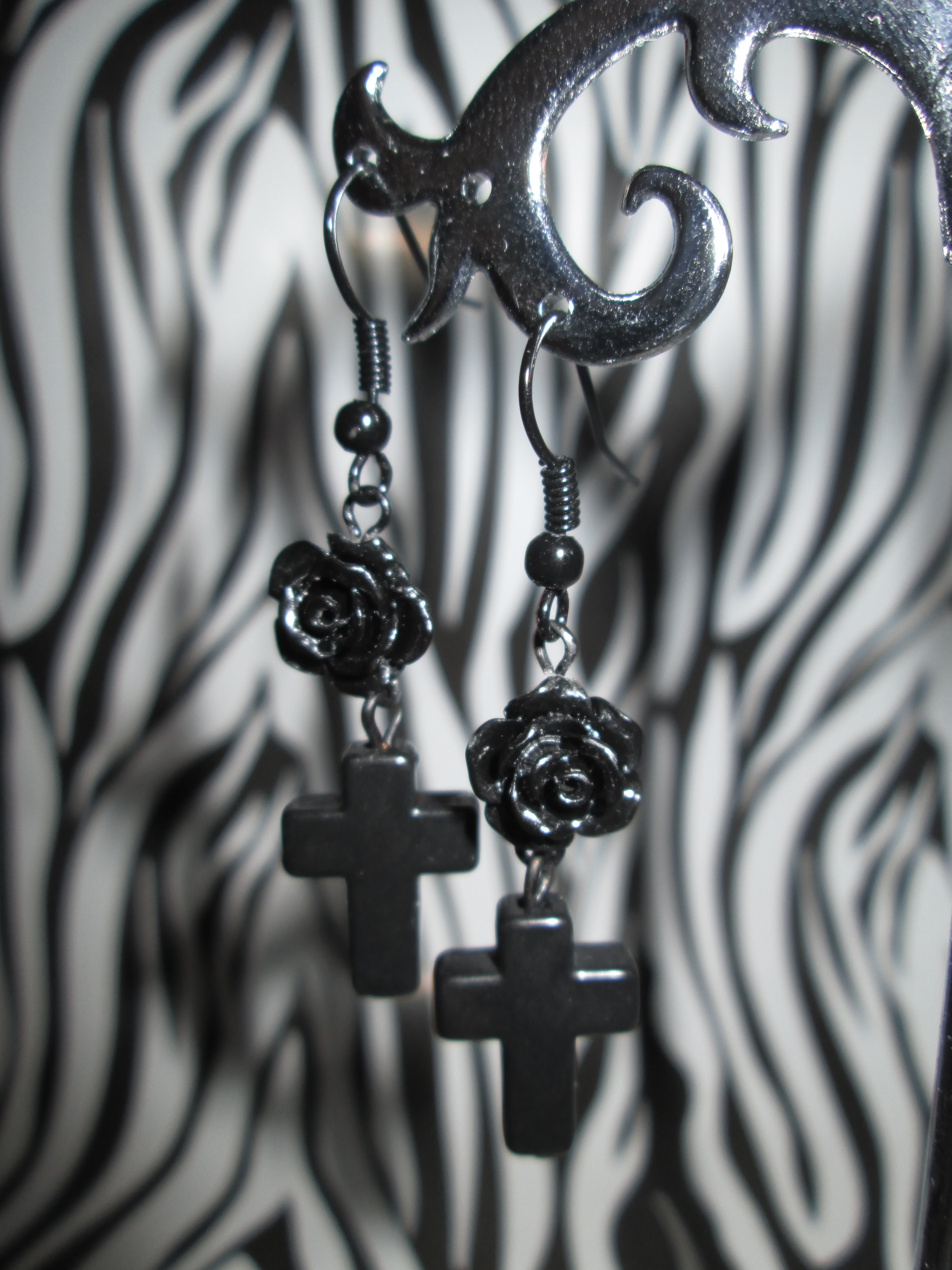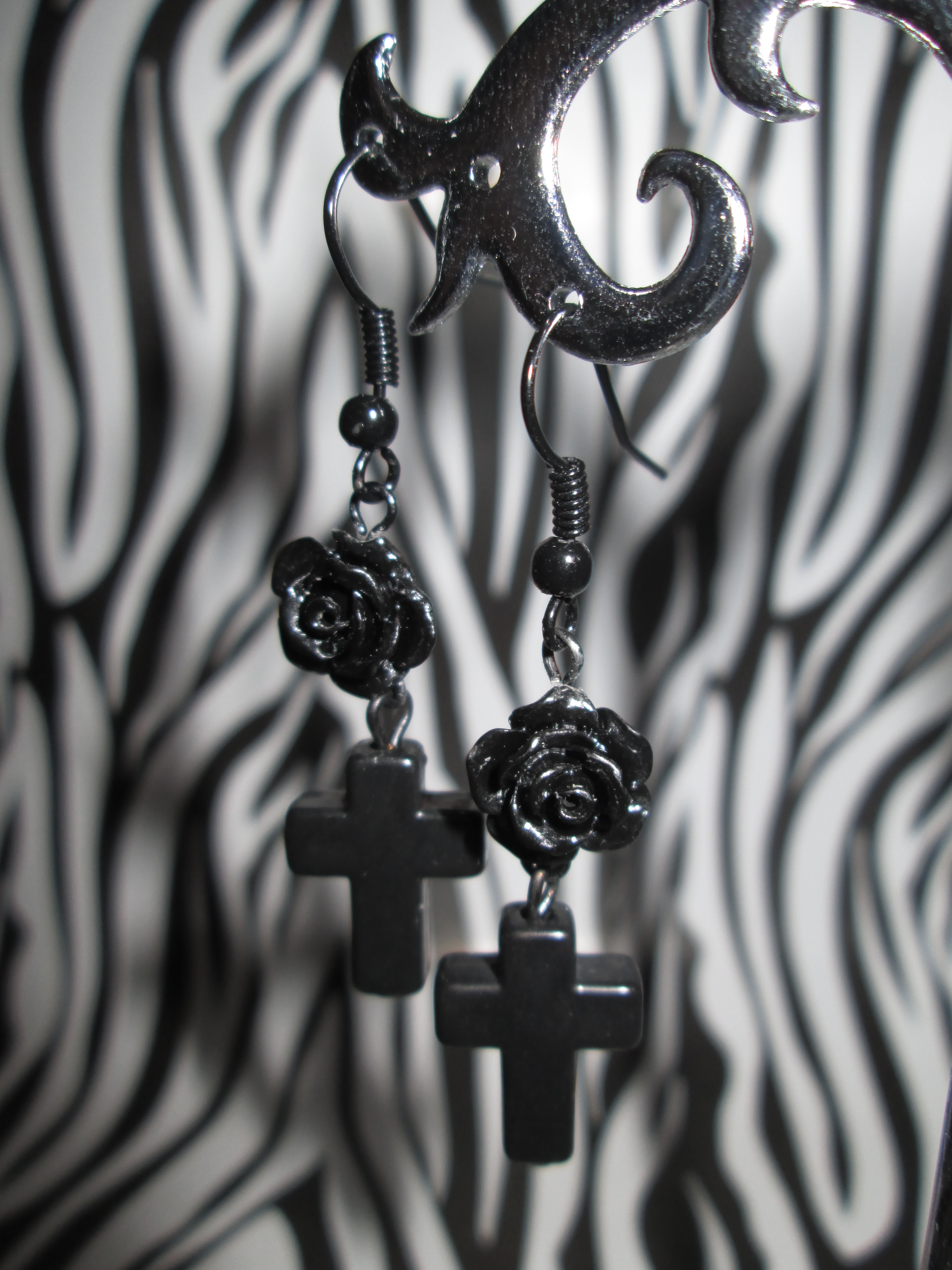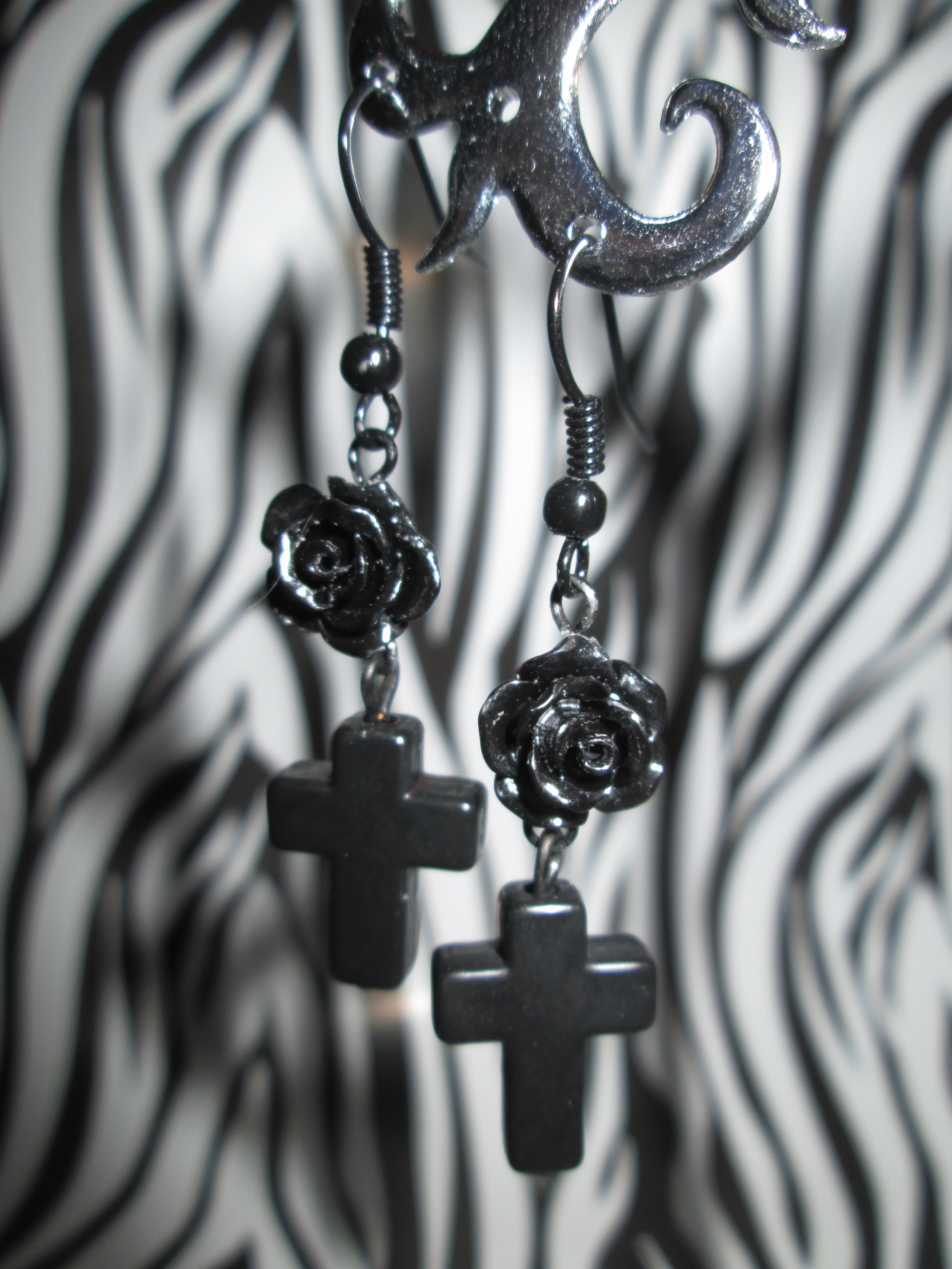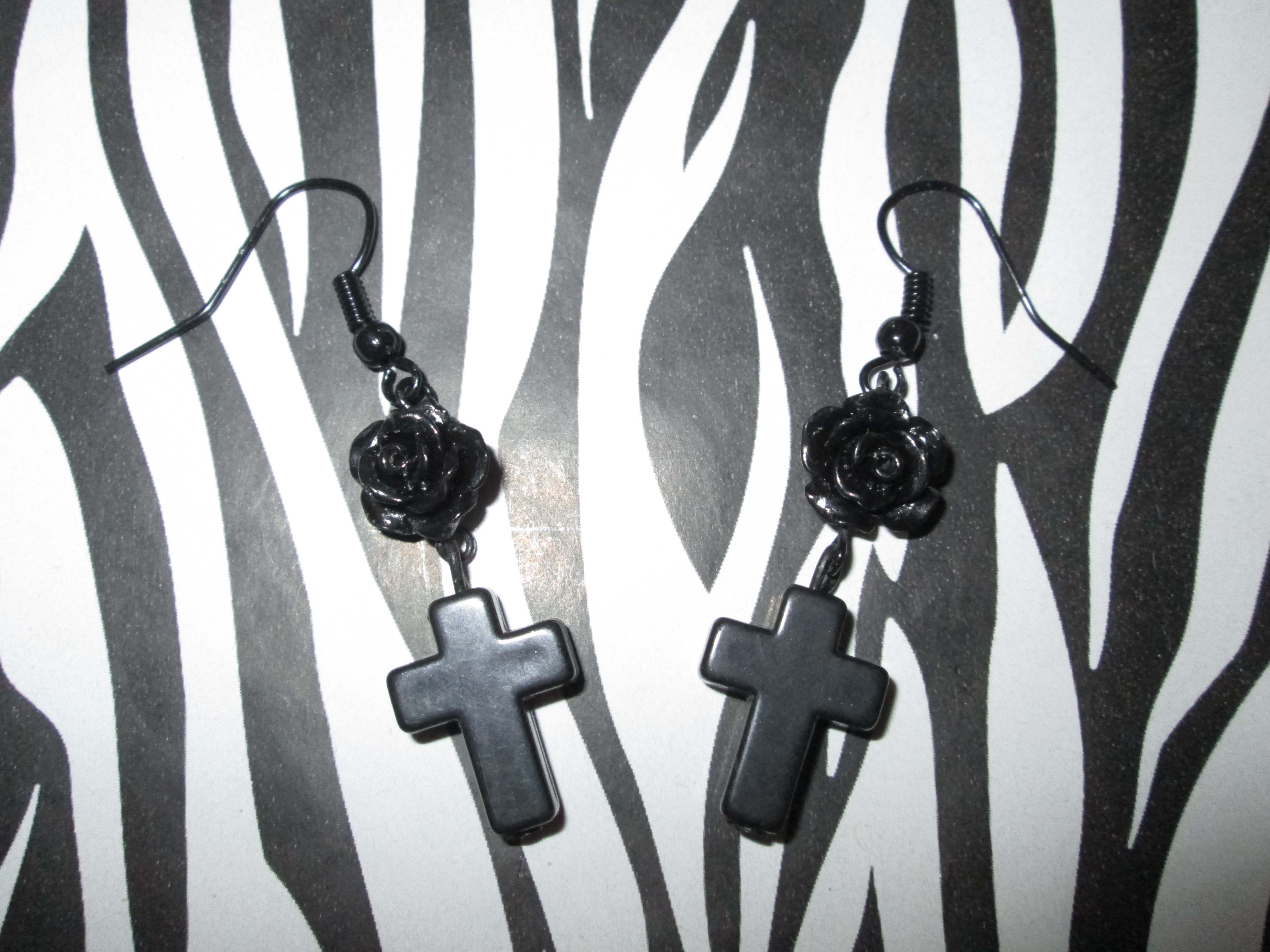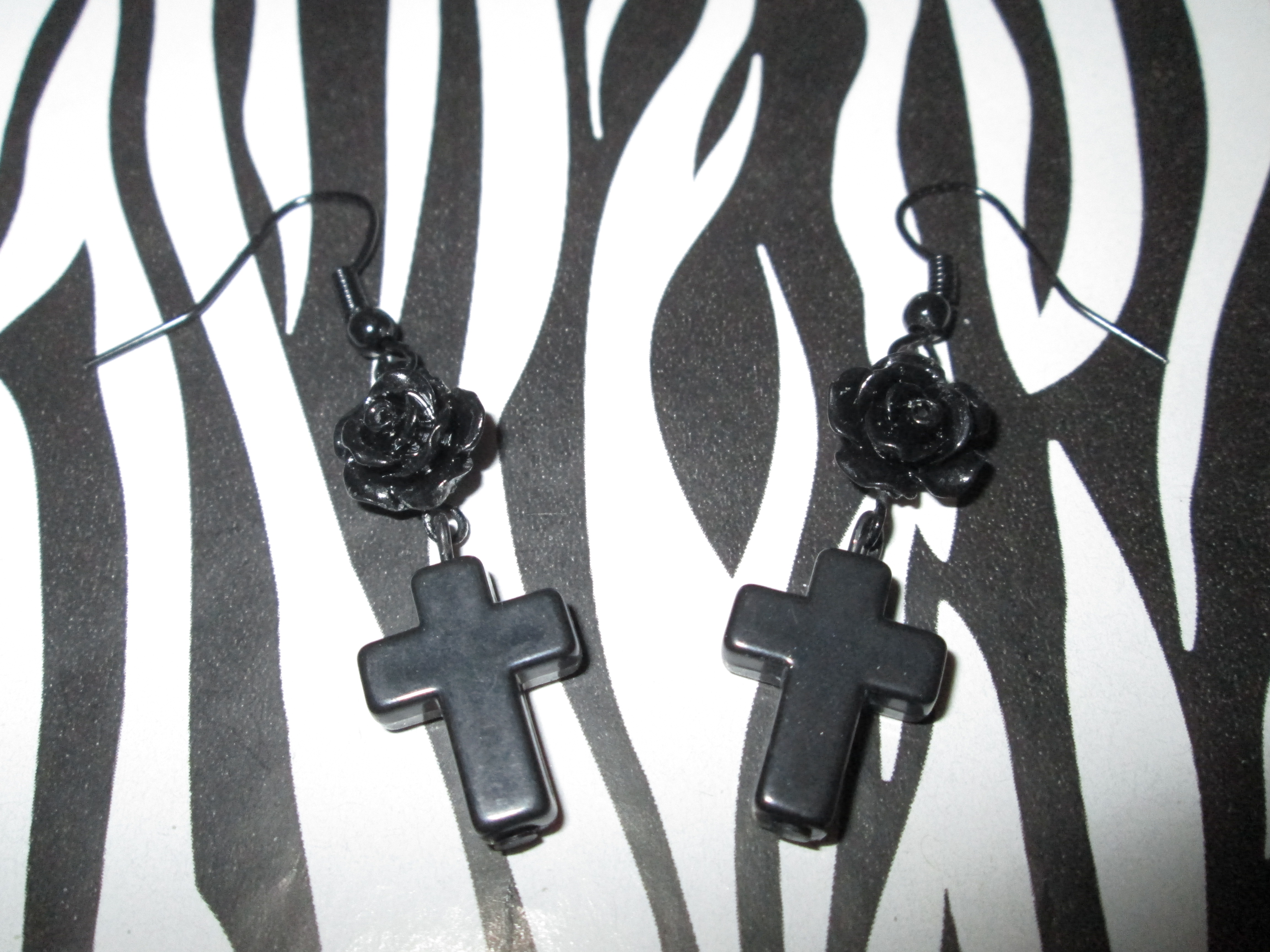 Classiquement belles! Ces boucles d’oreilles consistent des petits billes des roses noires, des petites croix noires, des fils métalliques, et des crochets noirs. Vraiment jolies!