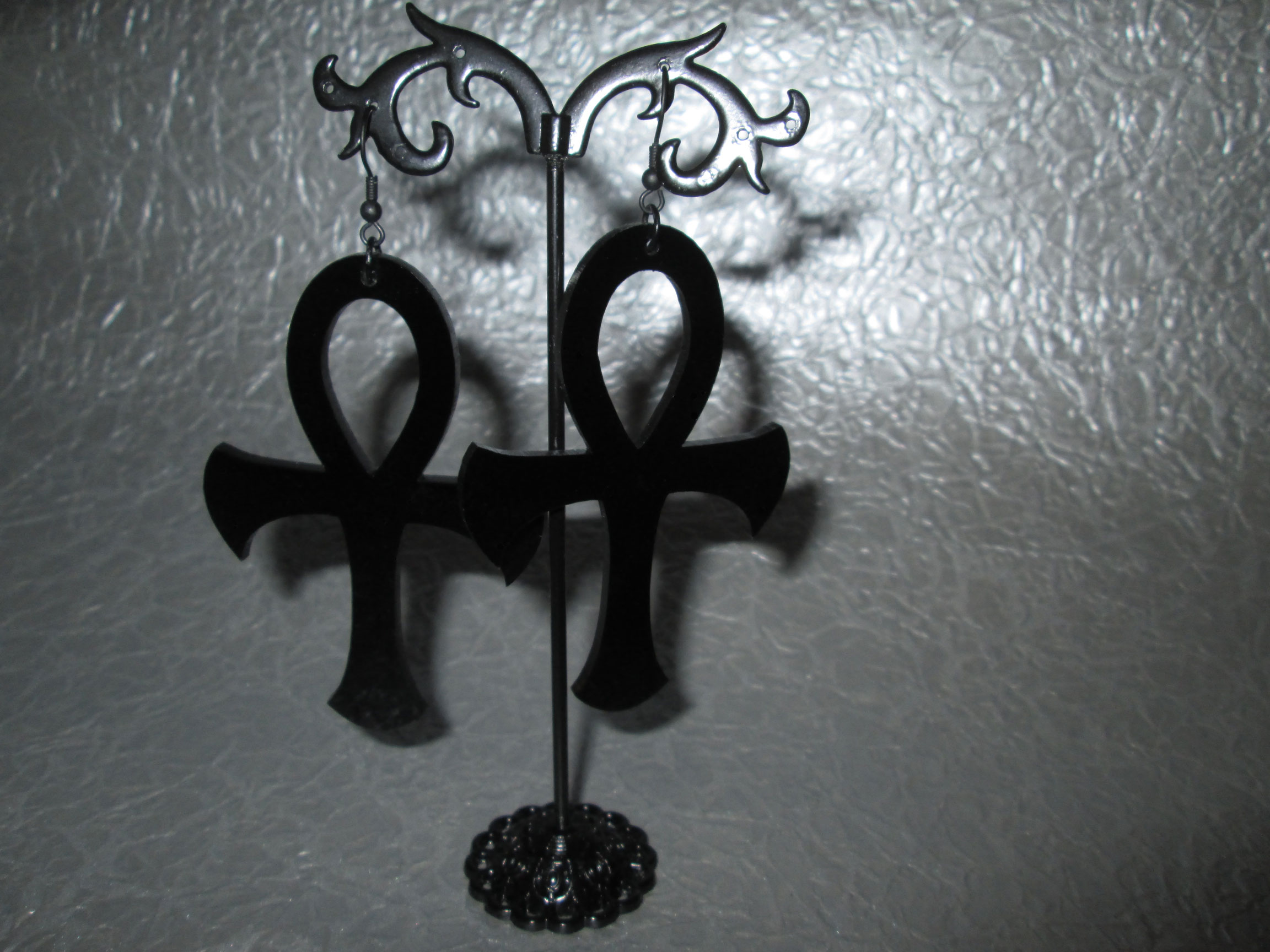 These earrings are not for the faint of heart! They are big and beautiful, consisting of large black acrylic ankh pendants, black jump rings, and black earring hooks. Super striking!