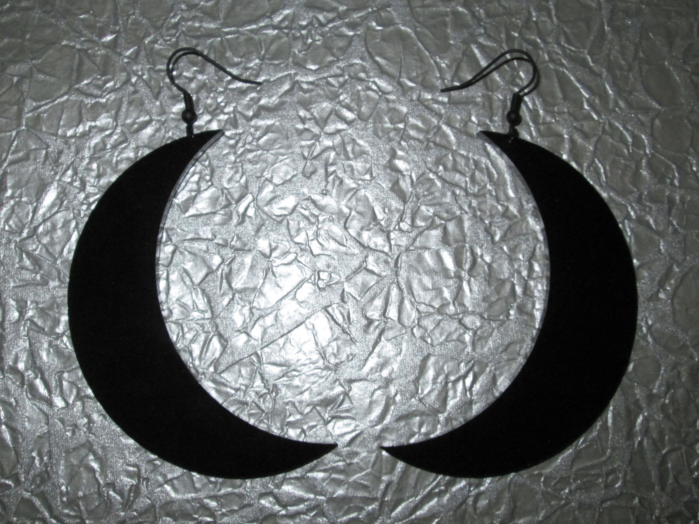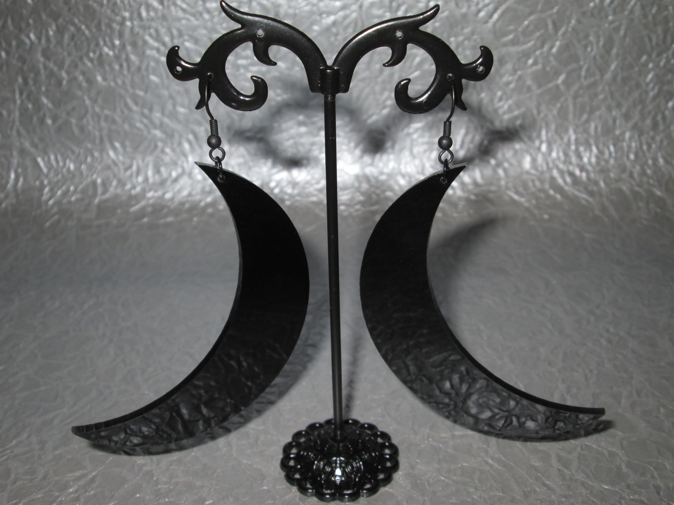 Ces boucles d’oreilles ne sont pas pour les âmes sensibles! Elles sont grandes et belles, et consistent des pendentifs croissant de lune en acrylique noir, des anneaux noirs, et des crochets à boucles d’oreilles en noir. Vraiment frappant!