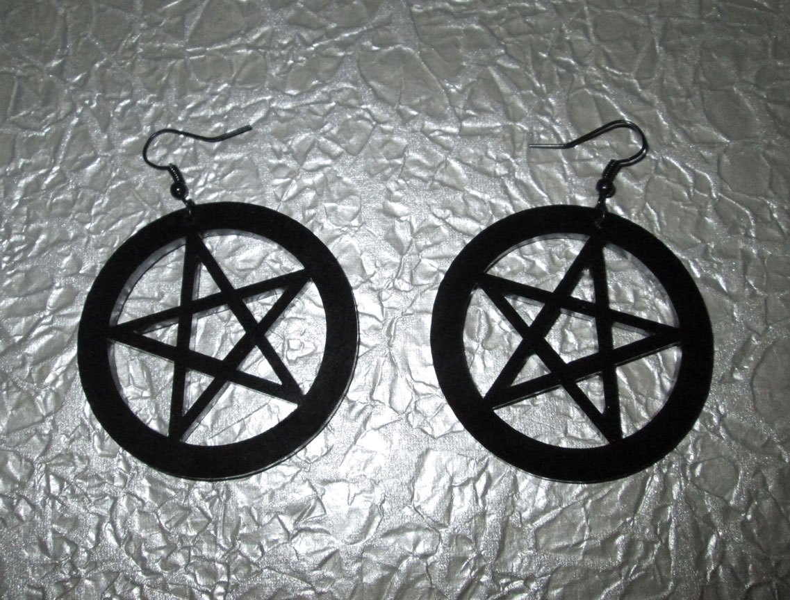 Ces boucles d’oreilles sont parfaites pour ceux et celles qui aiment les symboles occultes! Elles sont grandes et belles, et consistent des pendentifs pentagramme en acrylique noir, des anneaux noirs, et des crochets à boucles d’oreilles en noir. Vraiment frappant!