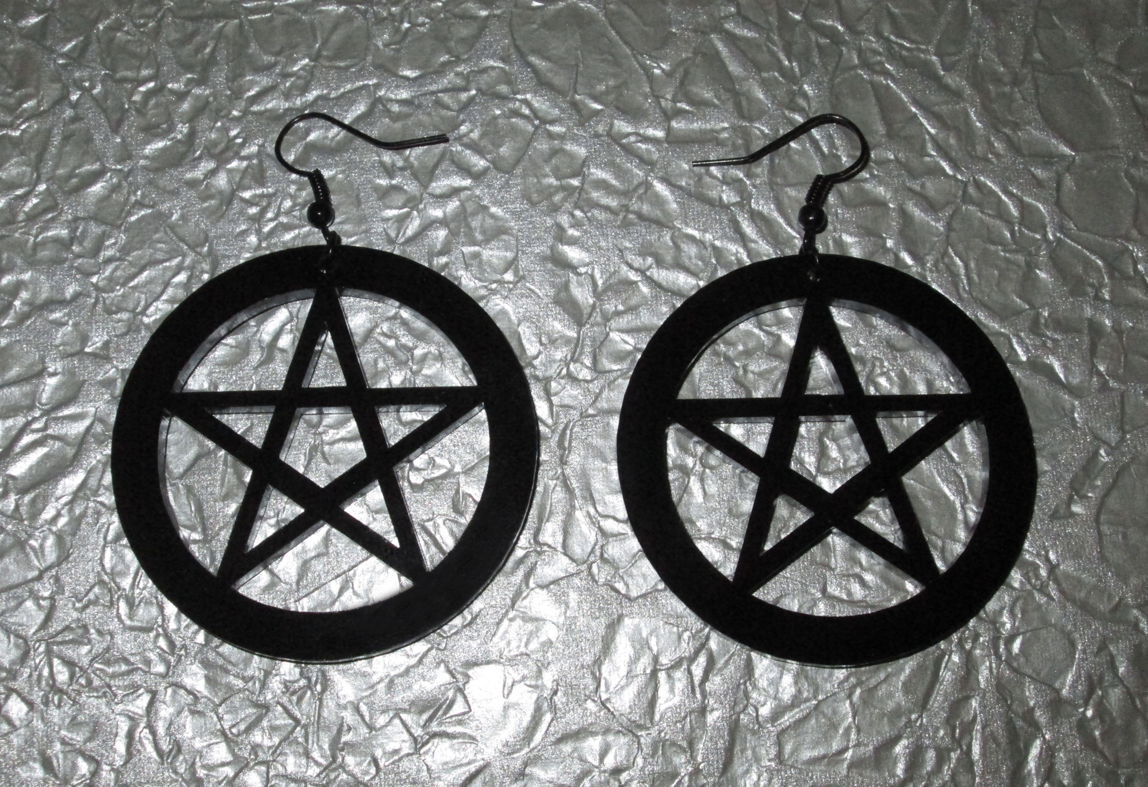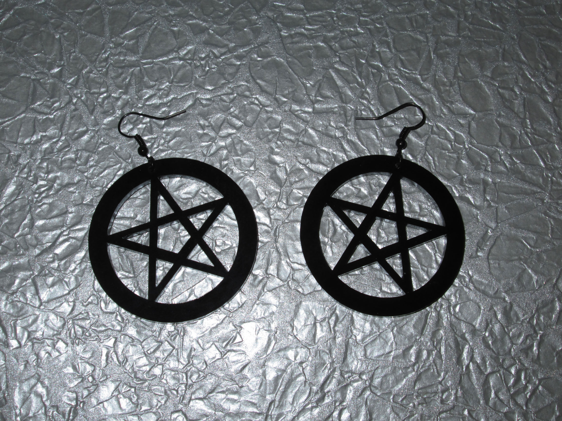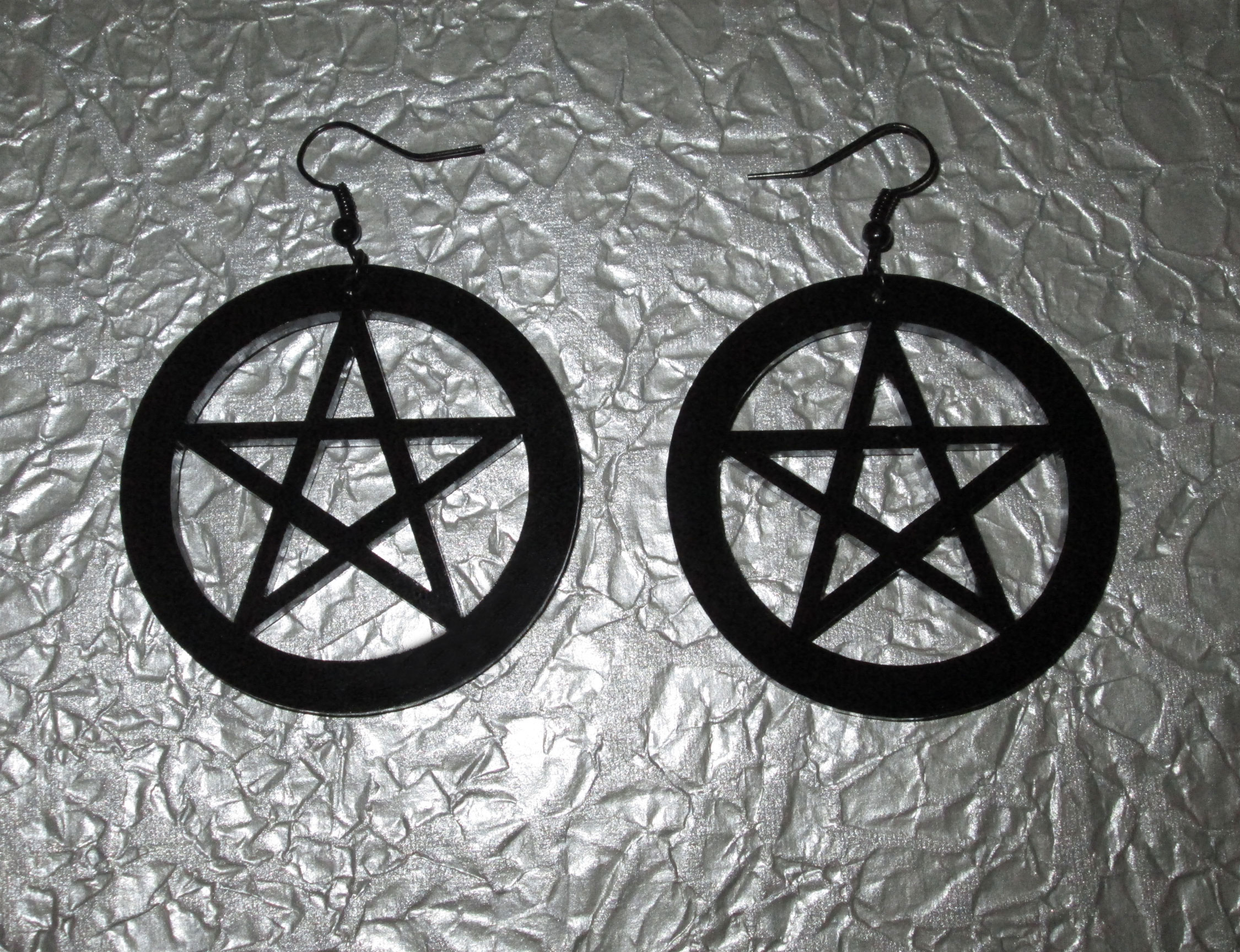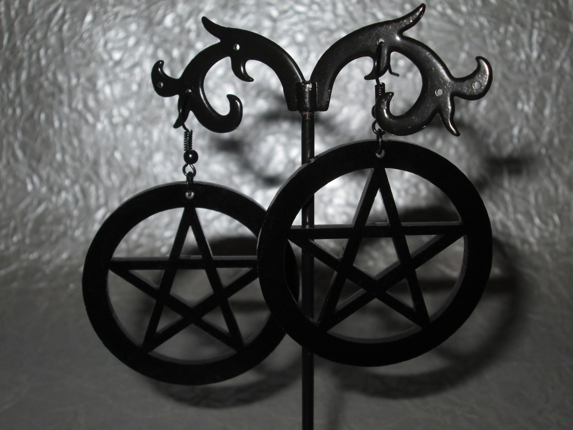 These earrings are perfect for those who love occult symbols! They are big and beautiful, consisting of large black acrylic pentagram pendants, black jump rings, and black earring hooks. Super striking!