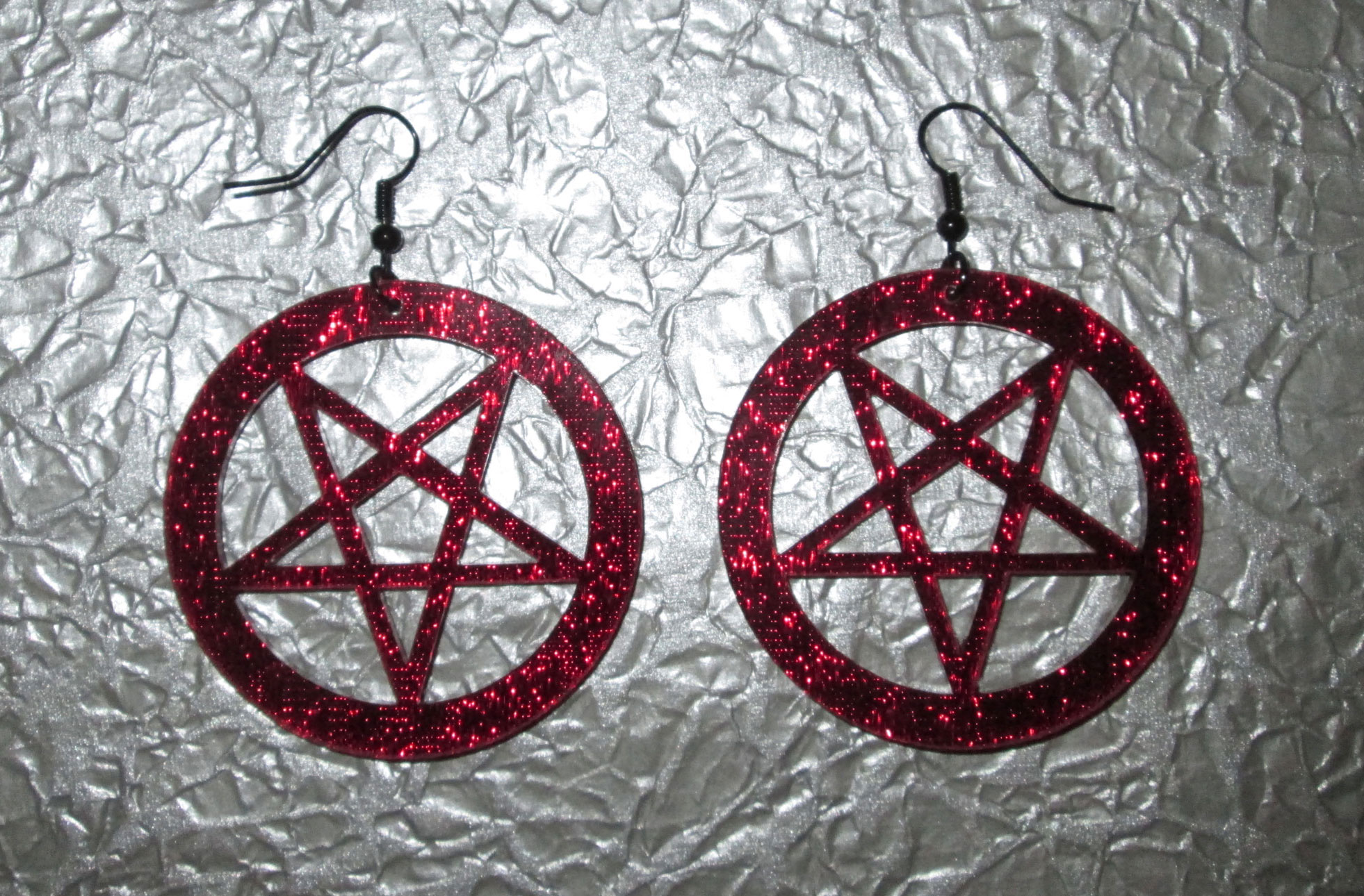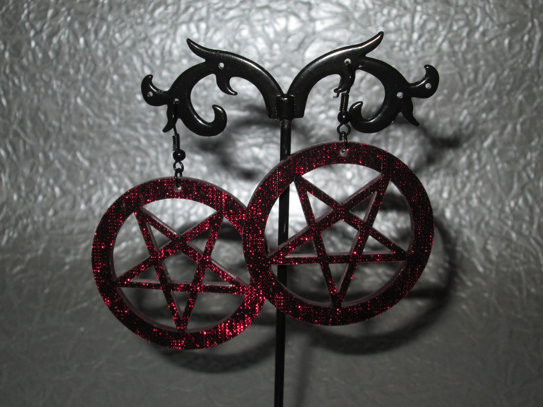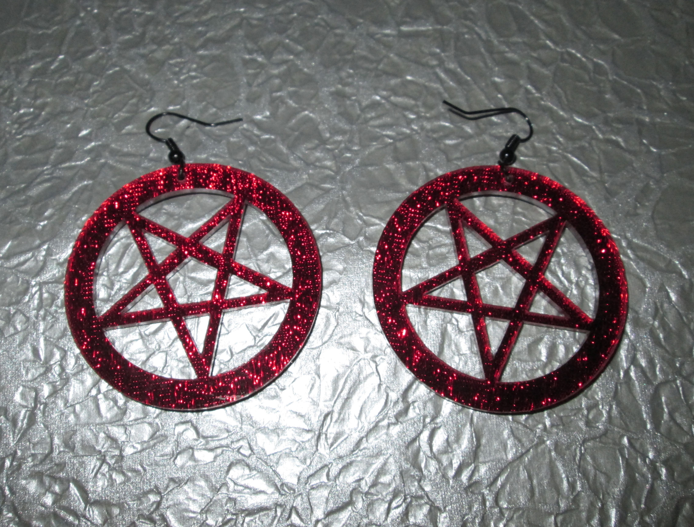 These earrings are perfect for those who love occult symbols! They are big and beautiful, consisting of large red acrylic pentagram pendants, black jump rings, and black earring hooks. Super striking!
