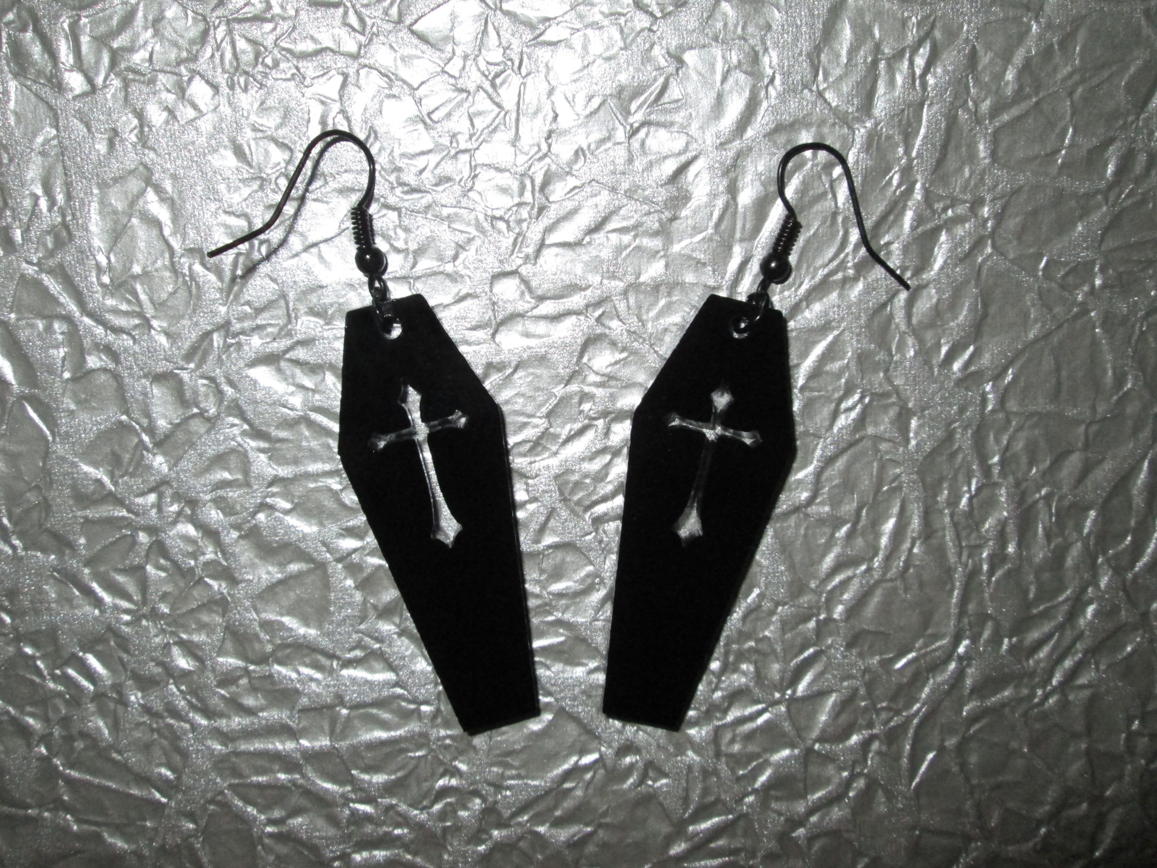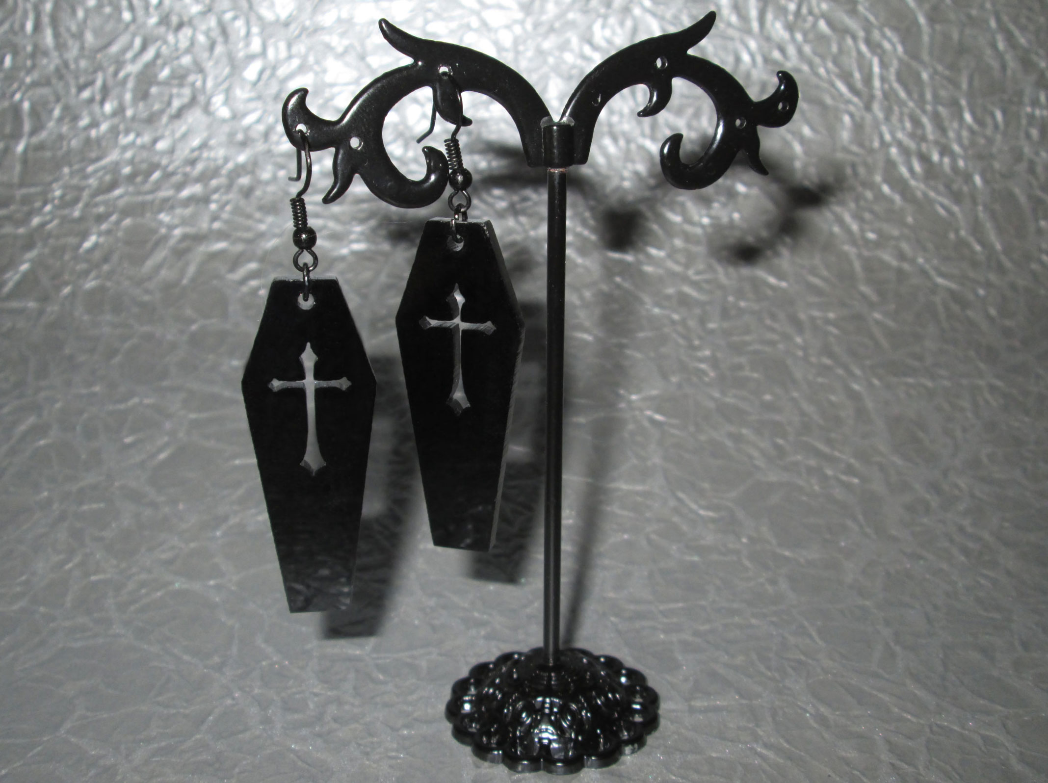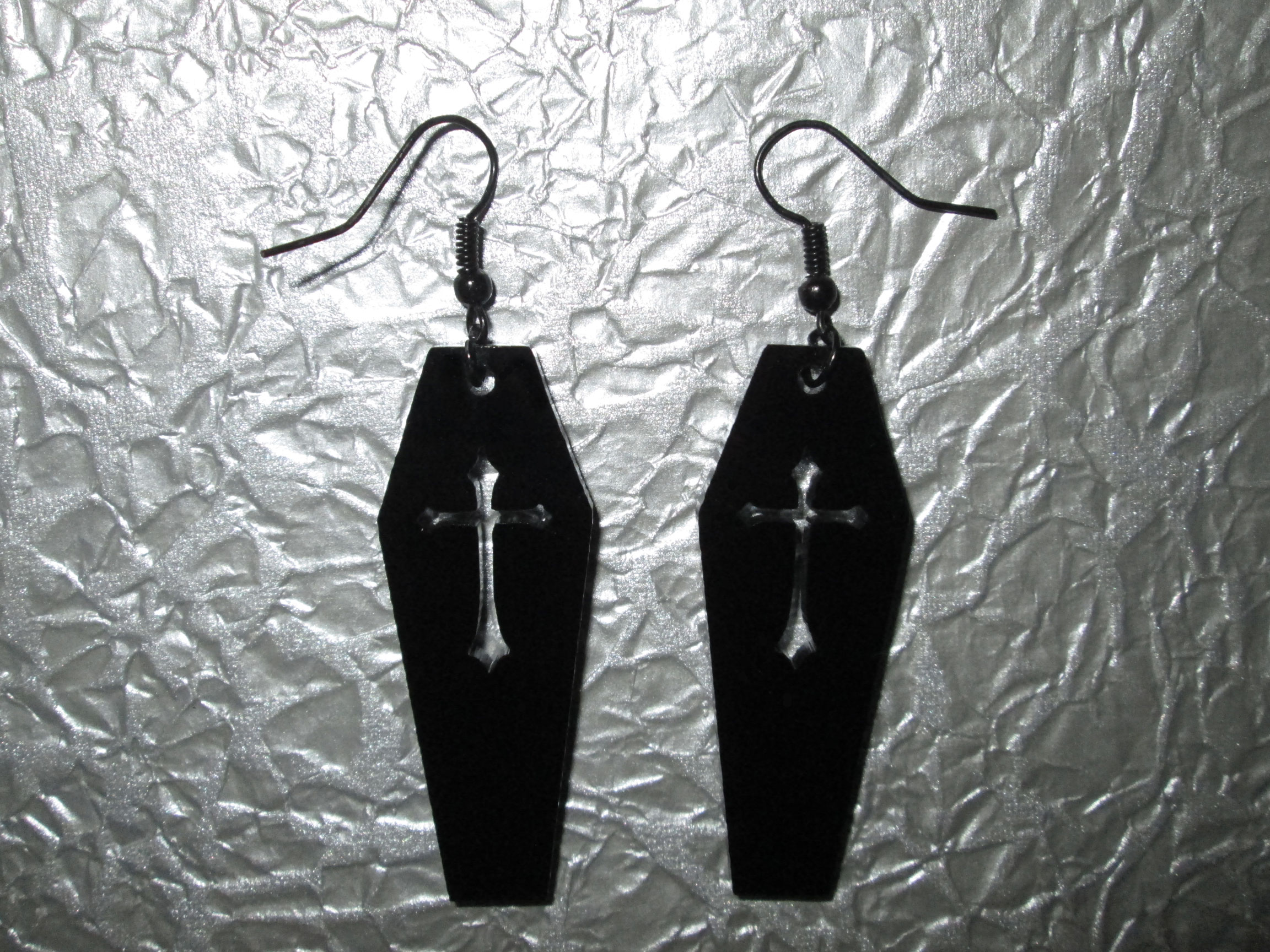 Ces boucles d’oreilles sont parfaites pour les gothiques! Elles consistent des pendentifs cercueil en acrylique noir avec des découpés crucifix, des anneaux noirs, et des crochets à boucles d’oreilles en noir. Pas trop pesant, mais elles sont très frappant néanmoins!