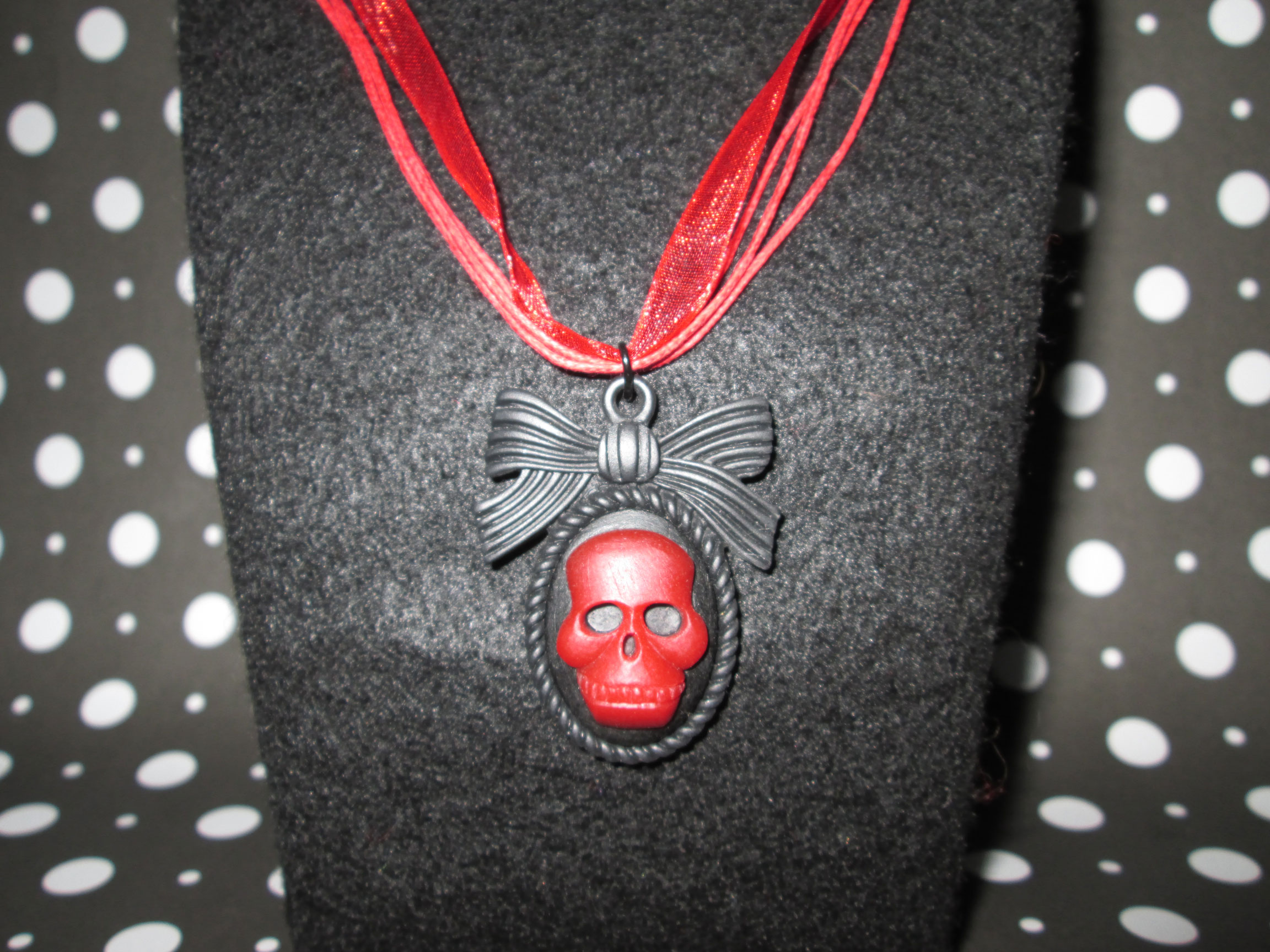 This necklace is not too big, but is definitely a centerpiece if worn alone, or a great complimentary piece if worn layered with other items. It consists of a red organza and cord necklace, black and red resin skull cameo, and black bow resin frame. Just lovely!