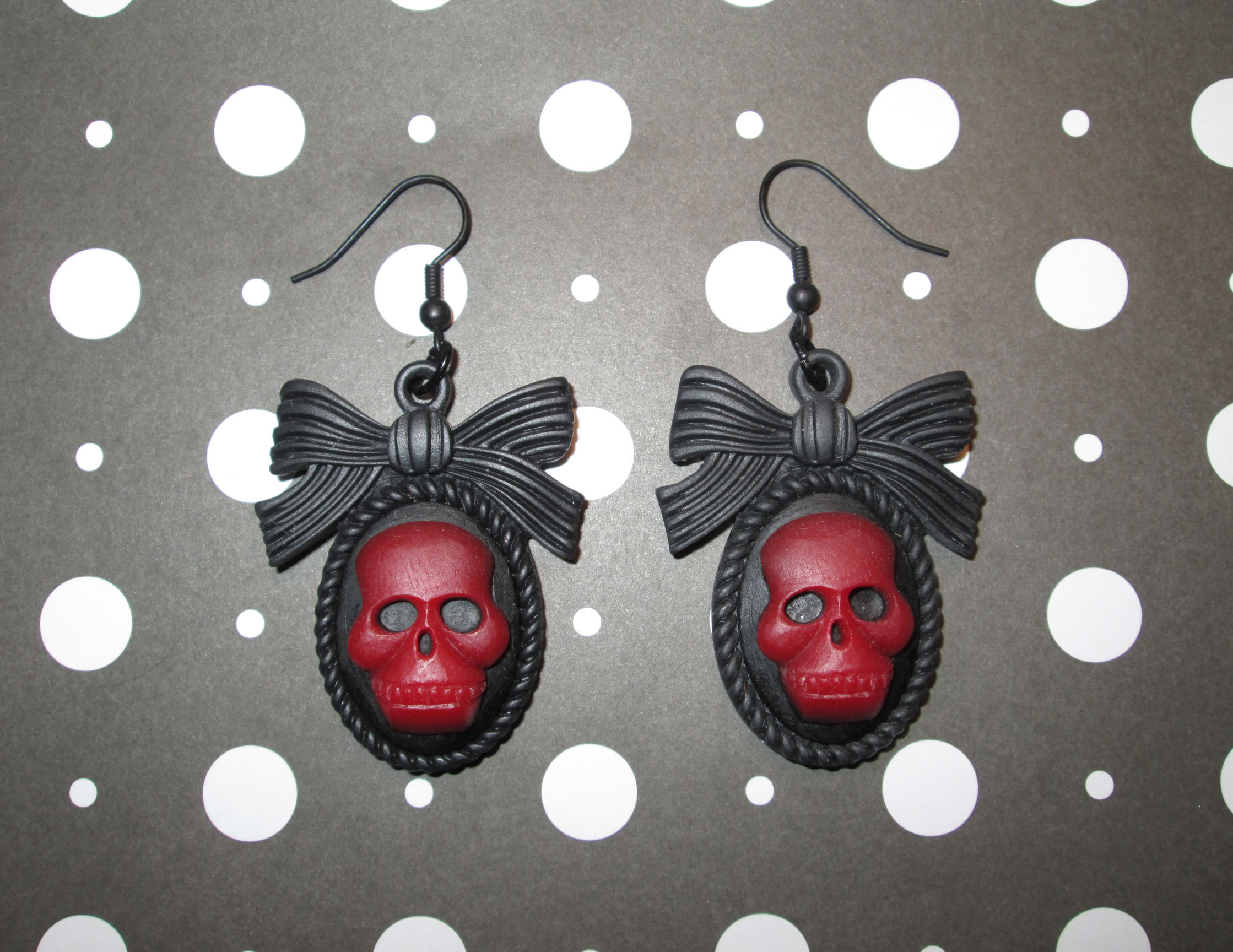 Red & Black Goth Loli Skull Cameo Earrings with Bow Frames