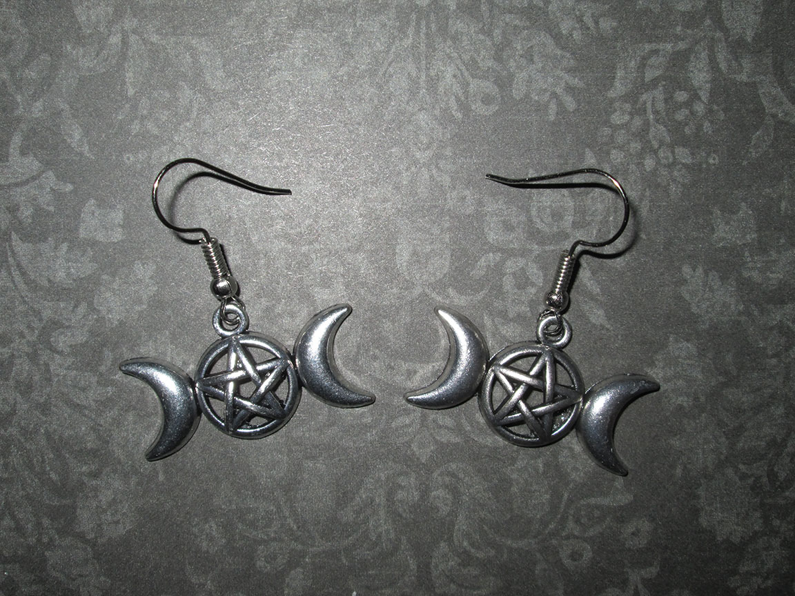 Jolies boucles d’oreilles en couleur argenté, avec des pendentifs délicats de la triple déesse avec croissants de lune et pentagrammes. Parfait pour ceux et celles qui aiment l’occulte, ou qui suivent les anciennes façons!