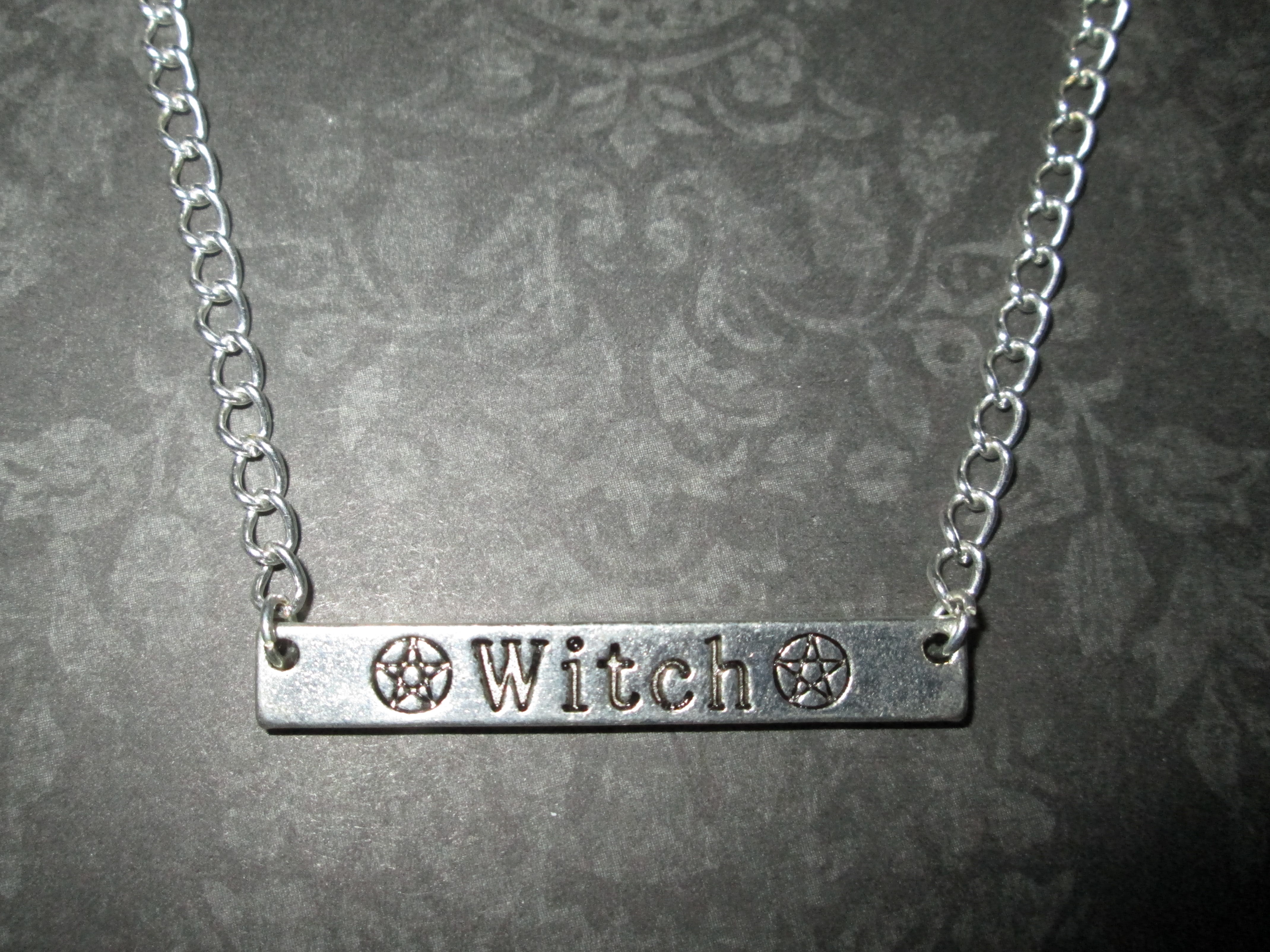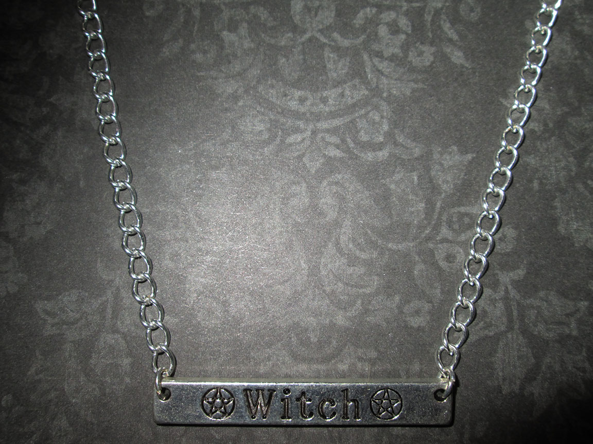 This is a simple necklace, but quite striking all at once. It consists of silver tone chain, and a metal bar pendant with pentagrams and the word “witch” engraved on it. It also has a crescent moon and star charm hanging from the extension in the back. The perfect piece for lovers of the occult, or just those who love the magical side of life!