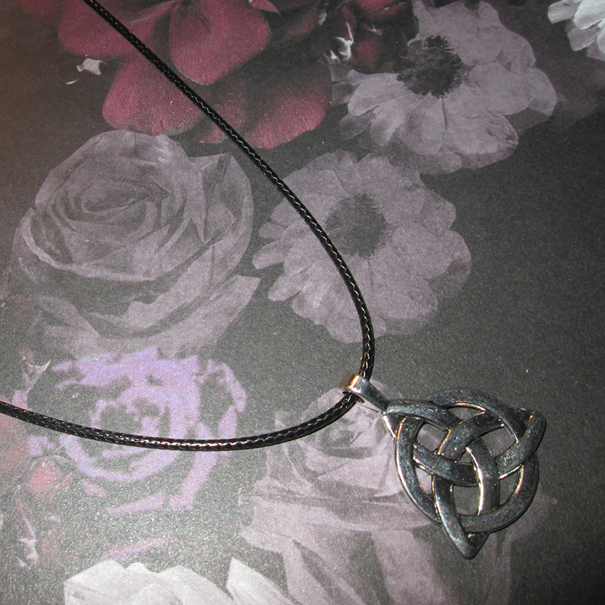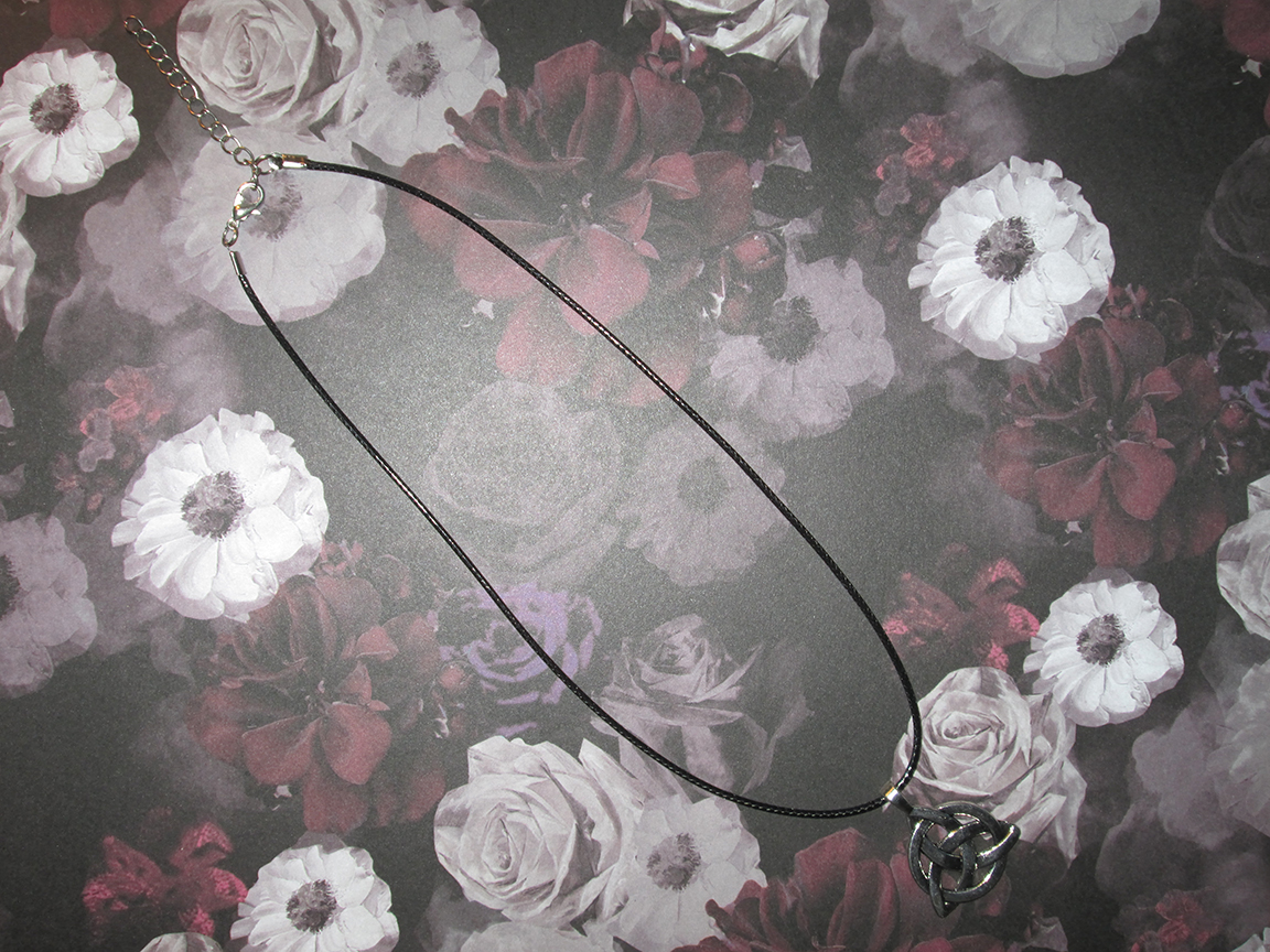 This is a simple necklace with a classic Celtic knot pendant. It has a waxen cord with a metal clasp, and a Celtic knot pendant with an antique silver tone to it. Just beautiful!