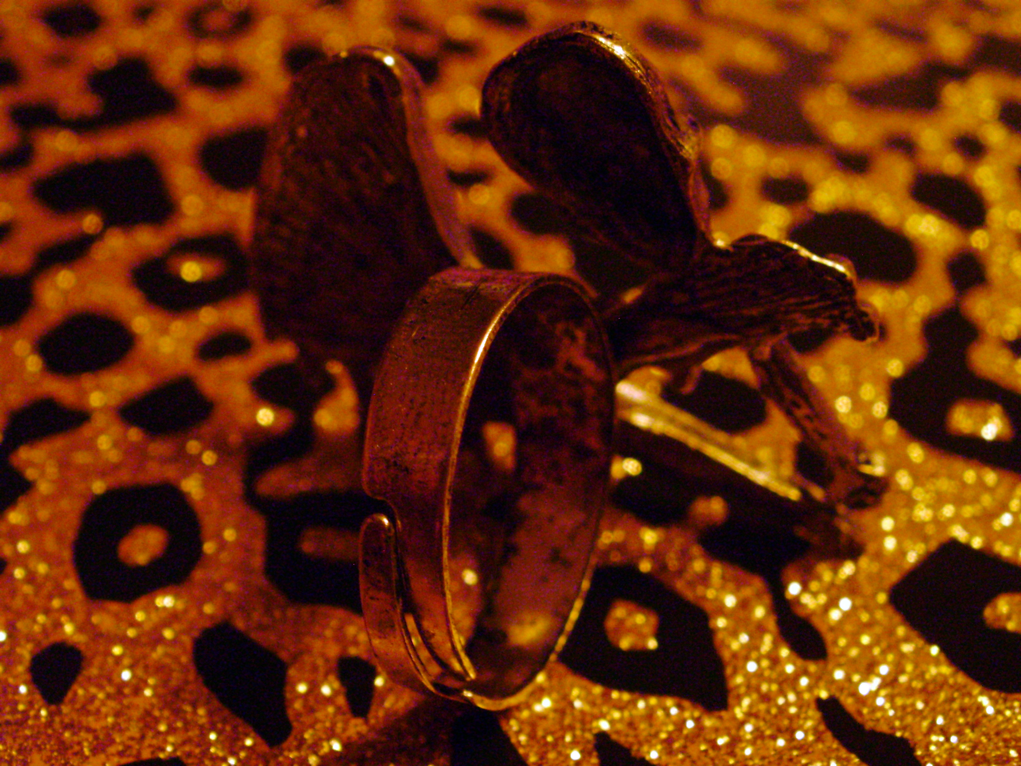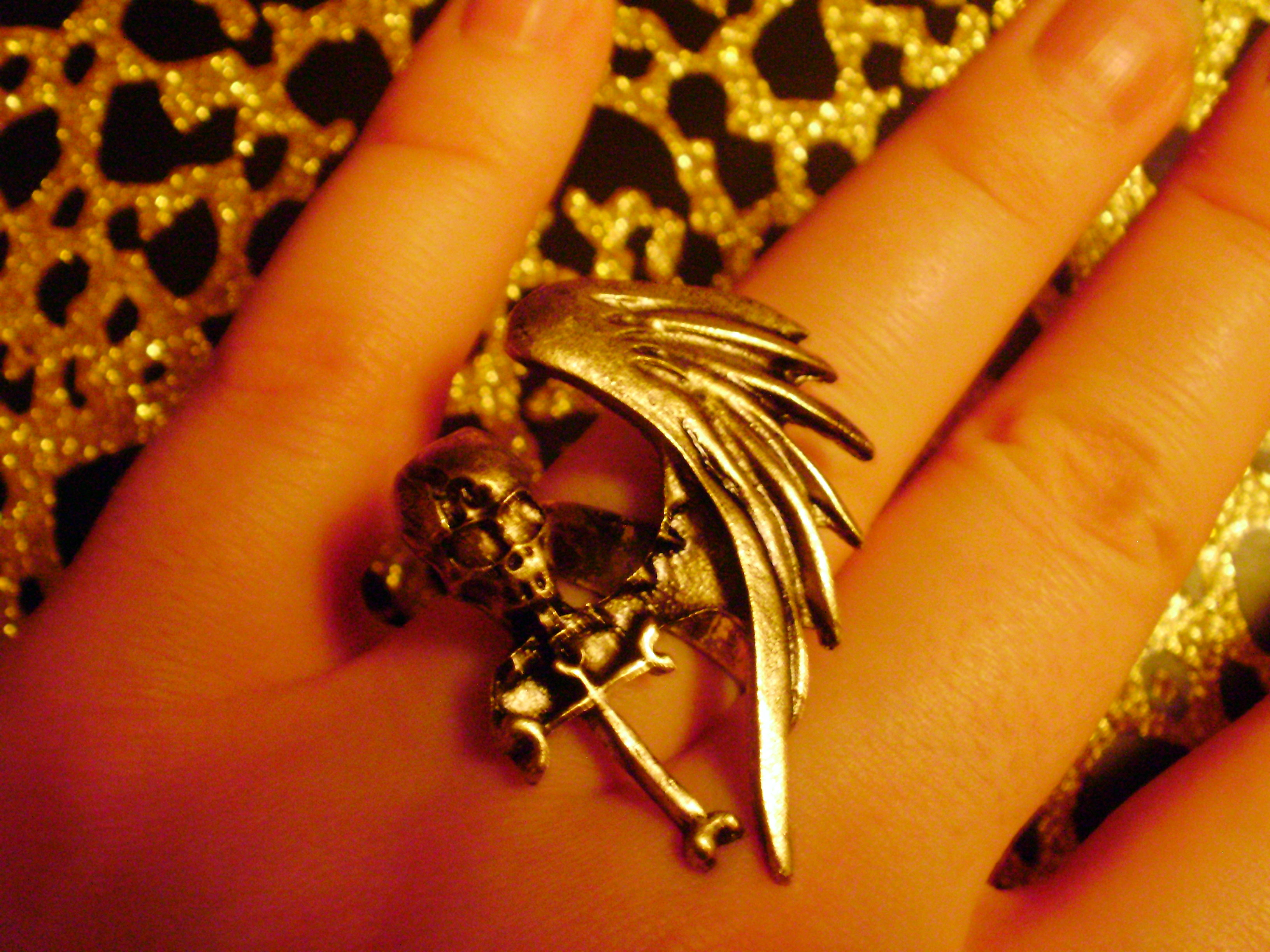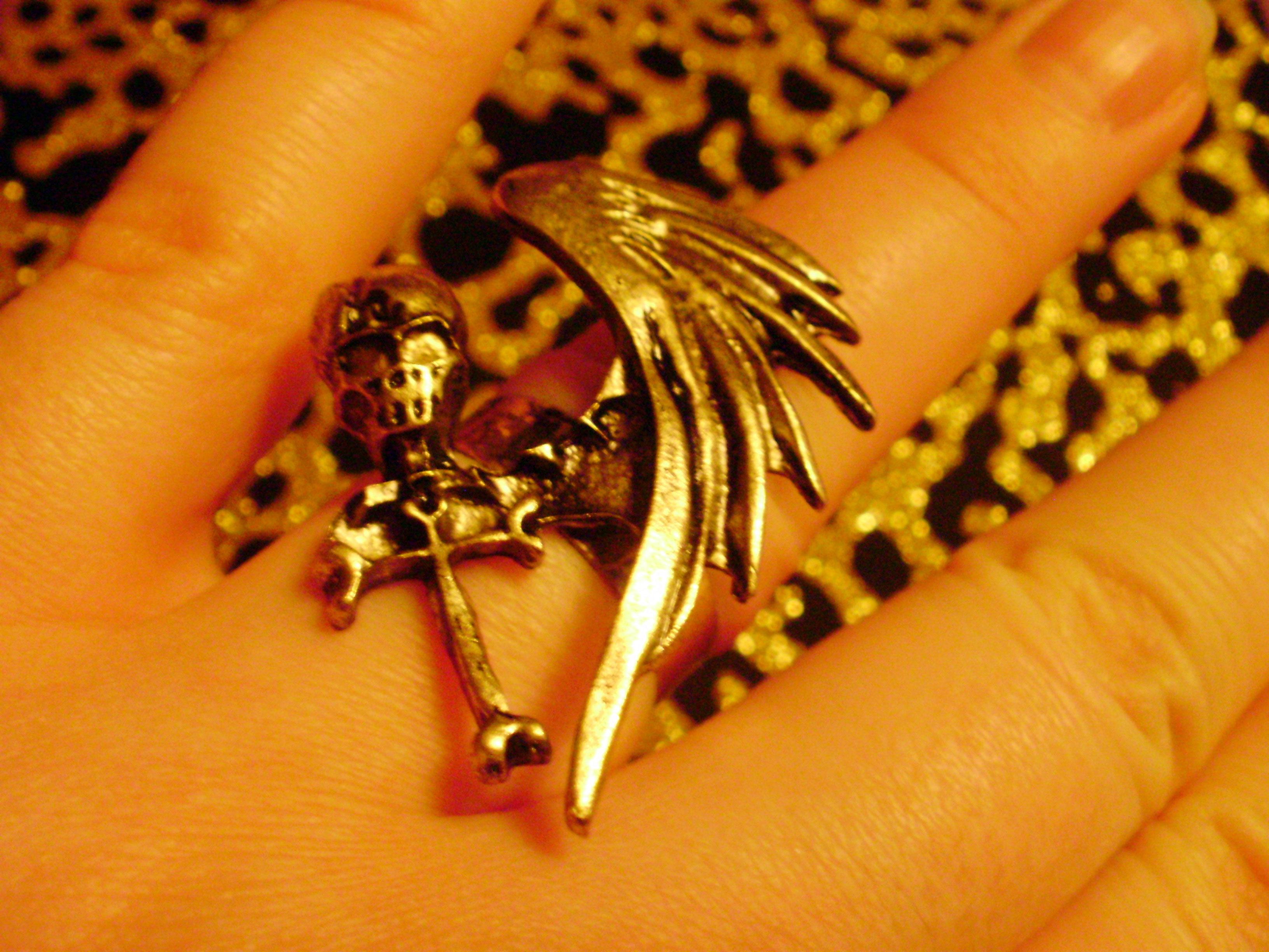 This is a lovely metal ring in an antique gold color. It sports a skull, a cross and a striking angel wing. It sits at an angle, making it a great accent piece. The size is entirely adjustable so it fits all ring sizes.