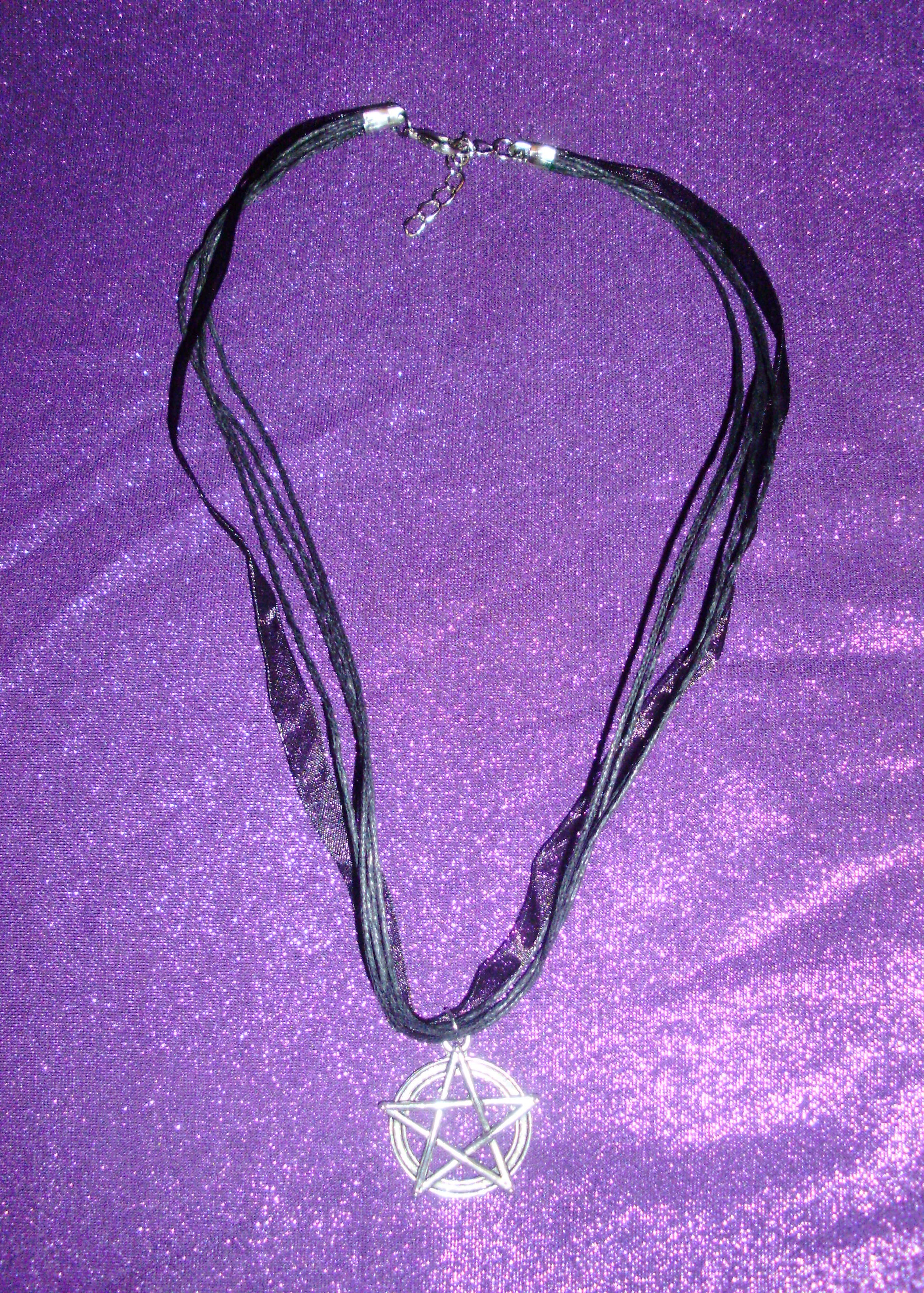 Here is a lovely pentagram necklace! It has a detailed pentagram pendant in a silver tone, with a black organza ribbon and waxen cords. It closes with a metal clasp. It’s a wonderful piece.