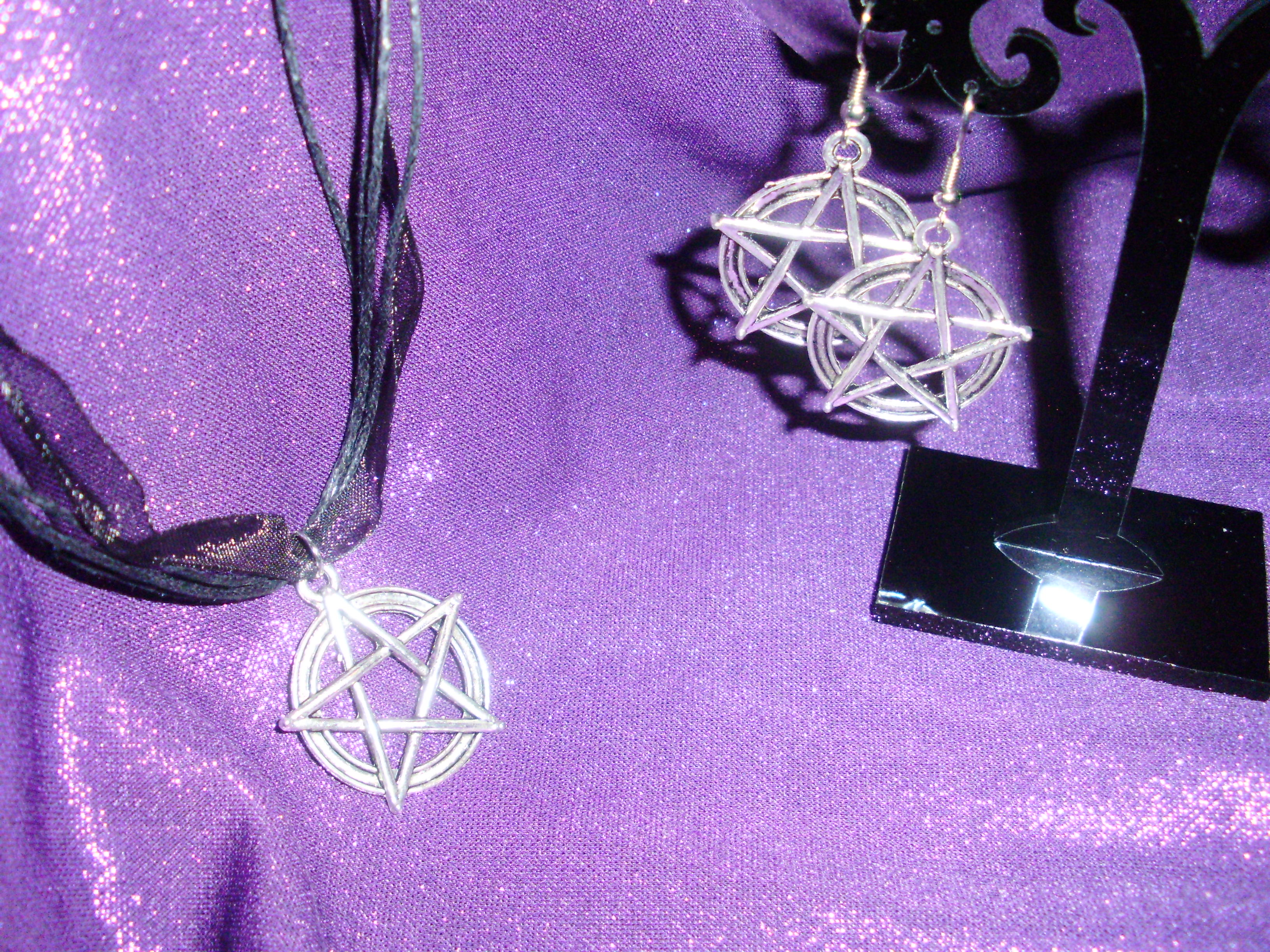 Voici un ensemble avec un joli collier et boucles d’oreilles pentacle. Le collier consiste d’un pendentif pentacle détaillée dans un ton argenté, avec du ruban d’organza noir et des cordons de cire. Ça ferme avec un fermoir en métal. Les boucles d’oreilles sont d’un pentacle dans un ton argenté. Elles sont vraiment agréable à porter, ces boucles d’oreilles sont frappant et sont une bonne taille, pas trop legères ni trop lourdes.