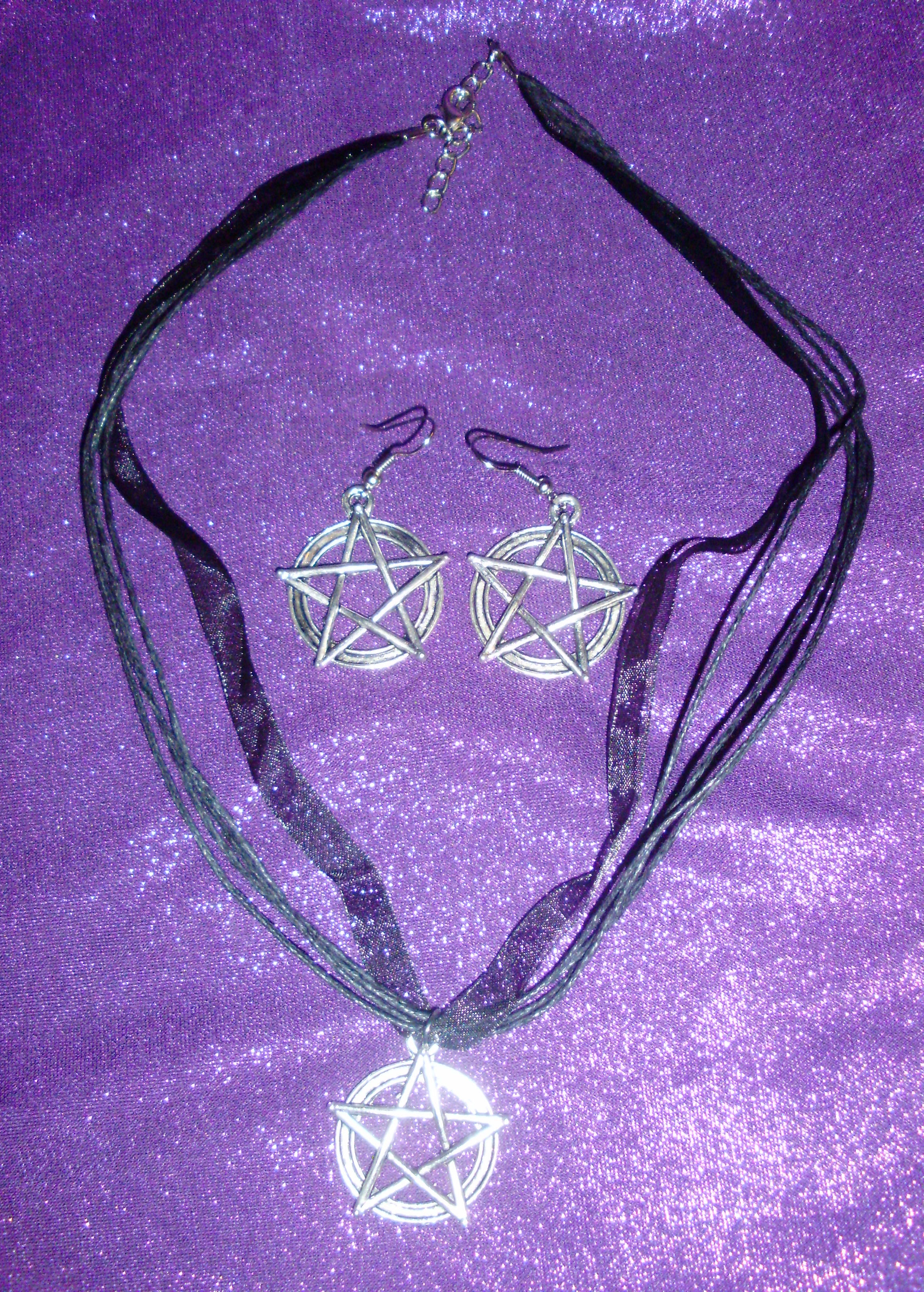 Here is a set with a lovely pentagram necklace and matching earrings. The necklace has a detailed pentagram pendant in a silver tone, with a black organza ribbon and waxen cords. It closes with a metal clasp. The earrings are also of a detailed pentagram pendant in a silver tone, they are striking and are a good size, not too light but not overly weighty either.