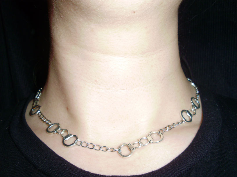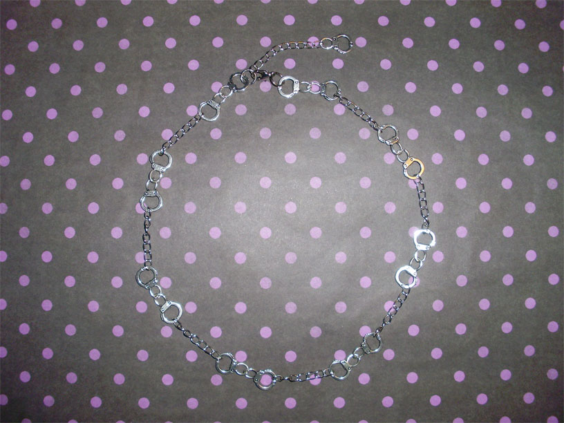 Voici un collier vraiment joli et frappant. Ce collier consiste de la chaîne argentée, des paires de menottes, et une seule menotte qui tombe à l’arrière du cou. Cette pièce est certainement une de mes meilleures créations, c’est surtout une pièce magnifique d’avoir.